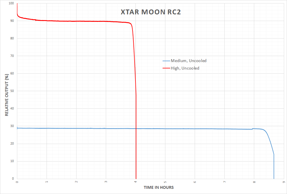 It is decidedly not to be disassembled, though. I contacted XTAR about this, and they said the two halves are “ultrasonically welded” together. Cracking that egg will break the Moon. It’d be nice for sure, to slip a higher capacity cell in there, but it seems like 2200 mAh is what it’s doing to stay. No,w if you were inclined to open the light destructively, then it’d be pretty easy – I expect those ultrasonic welds would pop right open with a hammer blow or two.