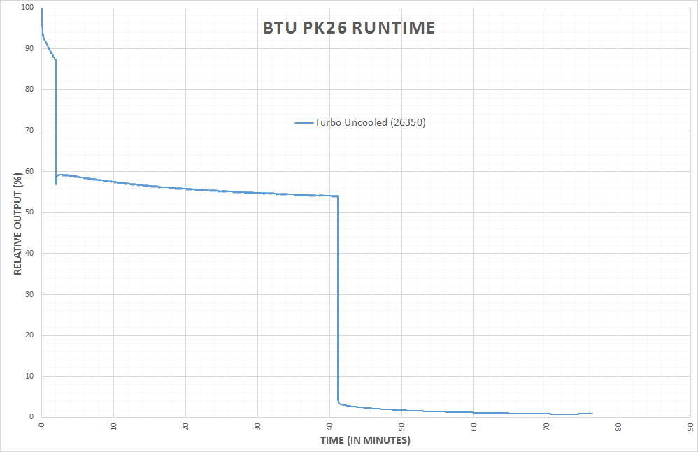 My runtime on the provided 26350 cell, which I believe is 2000mAh.