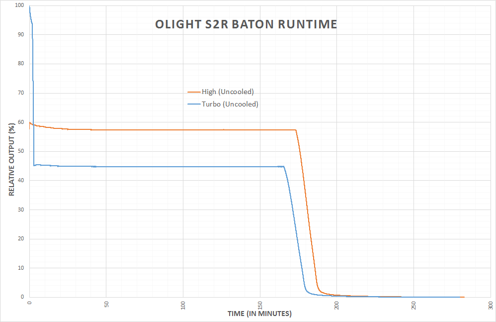Sorry to say, I forgot to check the termination voltage on the first S1R v2 runtime test! The second runtime test, the cell read 1.8mV after the test. 1.8mV that’s right. That’s with a protected cell. I wasn’t sure what was going on there. I immediately tested a different cell (actually a D cell), and it tested about right (around 1.4V ish), so my equipment and technique were fine. As far as I know, I’ve never tripped protection on a cell, but I believe this is what it looks like. I charged the cell all day, and it now works just fine. The take-home is that it appears the S1R v2 does not have low voltage protection. One nice sidenote is that this means that the onboard charging can, in fact, recover 0.0V Olight cells. In later tests, the S2R performed exactly the same way – no low voltage protection, but with the protected cells, this isn’t really a problem. Tripping the protection in this way does not hurt the cells.