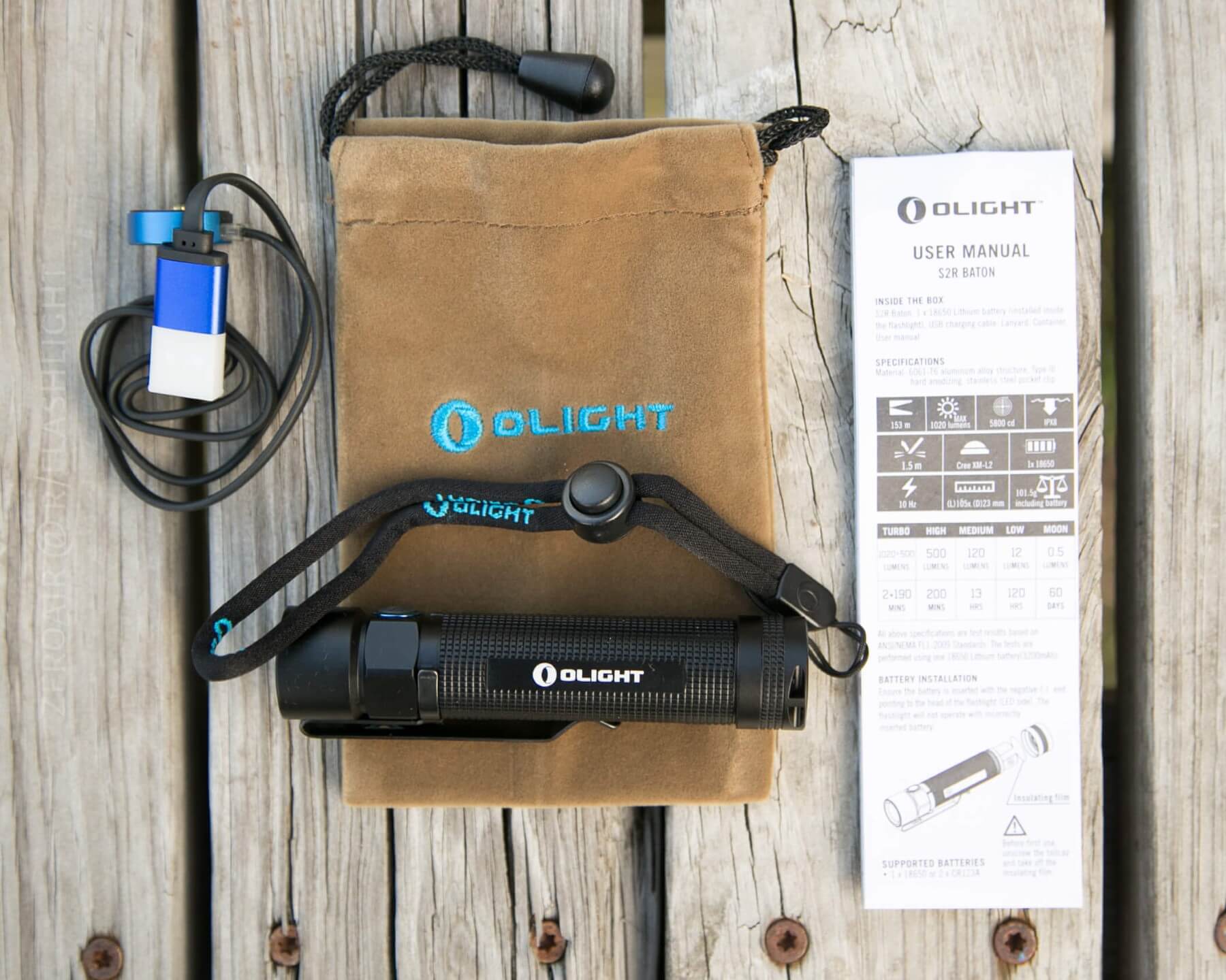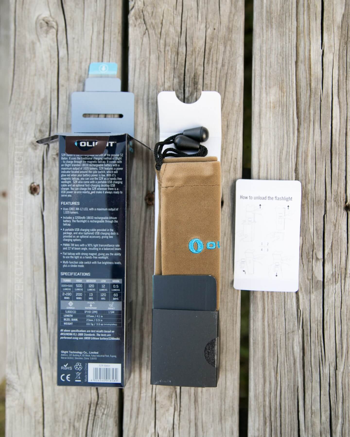 Olight has started packaging in very friendly packages. Everything – every step along the way of opening the package is described by a slip of paper. That’s fine, it works well, but it is a pain in the butt to get everything back in there like I want it. So win for descriptive packaging, but lose for complicated packaging on the same hand. The manual is also the current typical Olight manual – a large sheet of folded-up paper with many languages included. The manual has all the usual suspects like runtime quotes, user interface (UI), warranty concerns, etc.