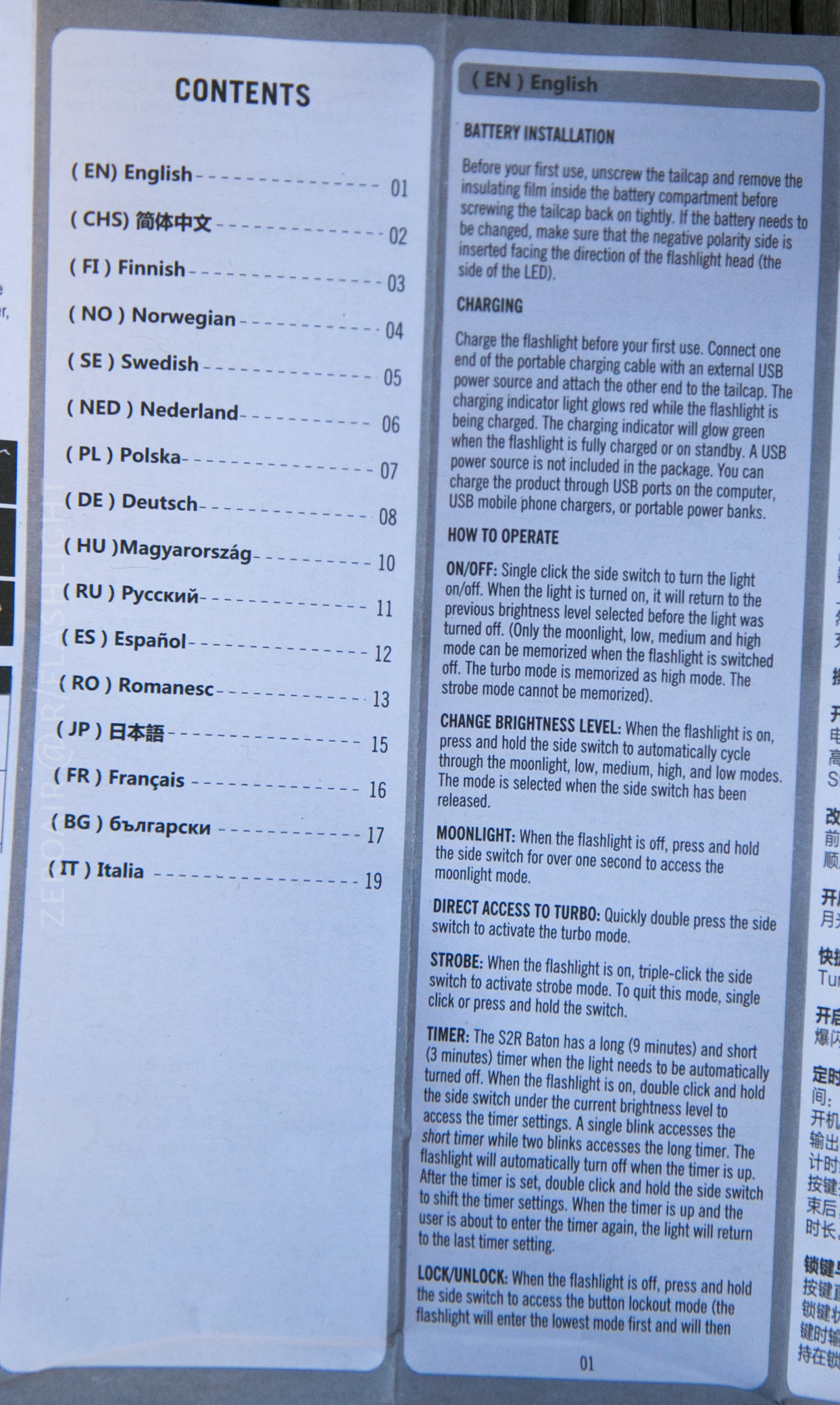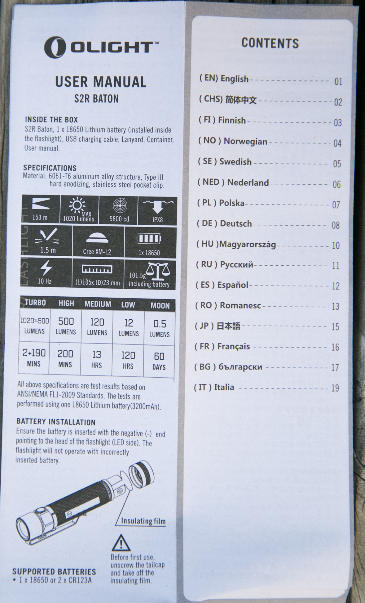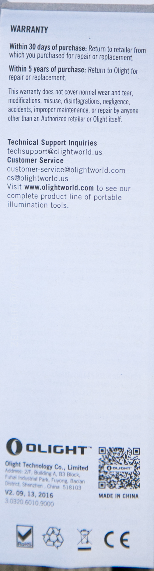 Olight has started packaging in very… sheeple… friendly packages. Everything – ever step along the way of opening the package is described by a slip of paper. That’s fine, it works well, but it is a pain in the butt to get everything back in there like I want it. So win for descriptive packaging, but lose for complicated packaging on the same hand. The manual is also the current typical Olight manual – large sheet of folded up paper with many languages included. The manual has all the usual suspects like runtime quotes, user interface (UI), warranty concerns, etc.
