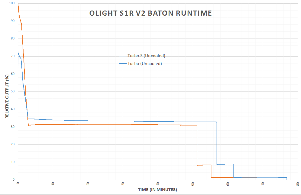 Sorry to say I forgot to check the termination voltage on the first S1R v2 runtime test! The second runtime test, the cell read 1.8mV after the test. …. 1.8mV that’s right. That’s with a protected cell. I wasn’t sure what was going on there. I immediately tested a different cell (actually a D cell) and it tested about right (around 1.4V ish) so my equipment and technique was fine. As far as I know I’ve never tripped protection on a cell, but I believe this is what it looks like. I charged the cell all day and it now works just fine. The take-home is that it appears the S1R v2 does not have low voltage protection. One nice sidenote is that this means that the onboard charging can in fact recover 0.0V Olight cells. In later tests, the S2R performed exactly the same way – no low voltage protection, but with the protected cells, this isn’t really a problem. Tripping the protection in this way does not hurt the cells.