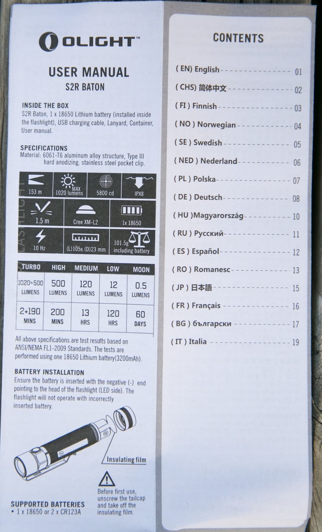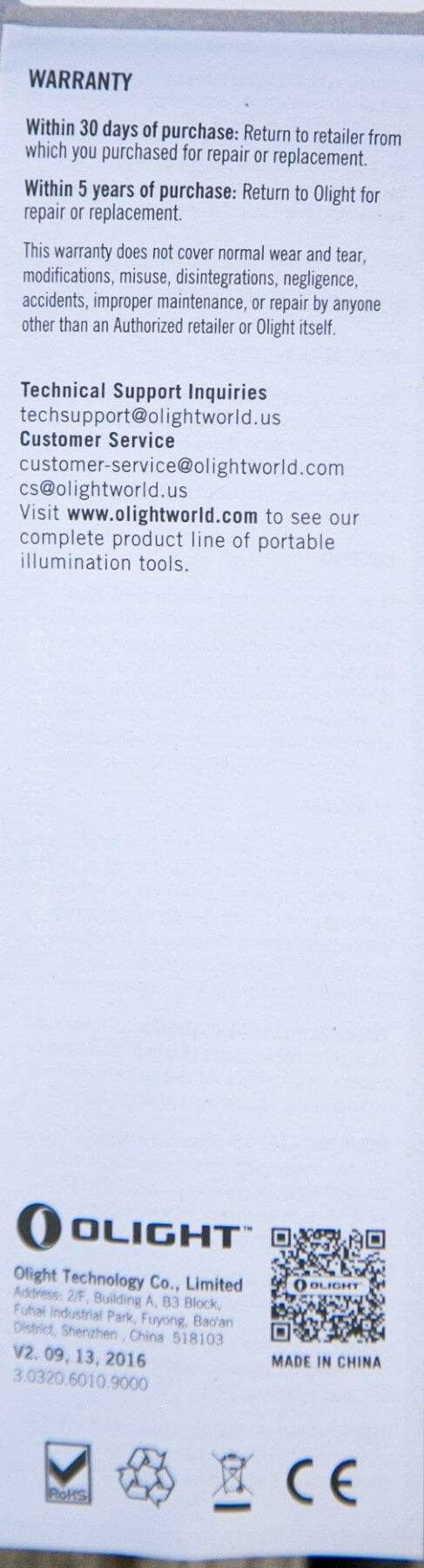 Olight has started packaging in very friendly packages. Everything – every step along the way of opening the package is described by a slip of paper. That’s fine, it works well, but it is a pain in the butt to get everything back in there like I want it. So win for descriptive packaging, but lose for complicated packaging on the same hand. The manual is also the current typical Olight manual – a large sheet of folded-up paper with many languages included. The manual has all the usual suspects like runtime quotes, user interface (UI), warranty concerns, etc.