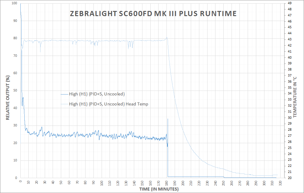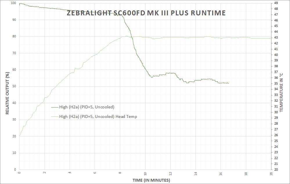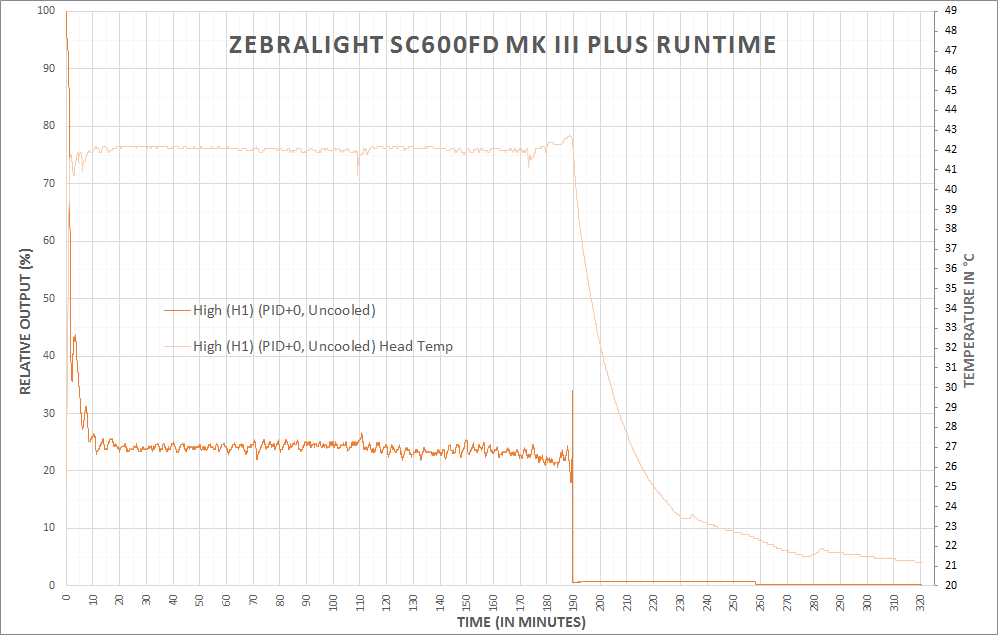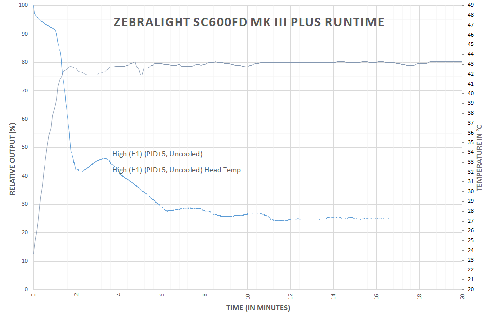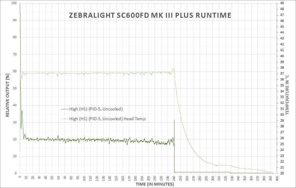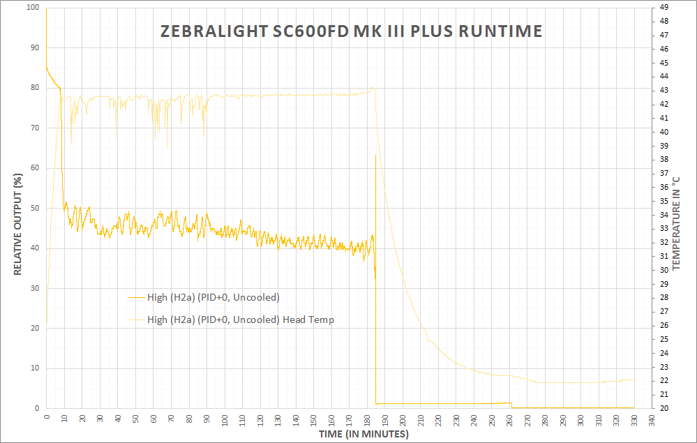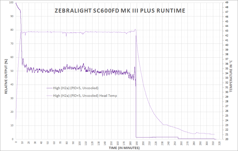 There’s an added question of why one might want to adjust the PID. The difference is approximately 35 degrees C head temp to appx. 45 degrees C head temp. Would you be able to feel this temp difference? Probably. Ideally, setting the PID to max (+5) would allow the light to run on the highest possible output without stepping down for longer. But that difference is going to be very minimal, and holding the light in-hand will certainly confound the PID settings in a general sense.