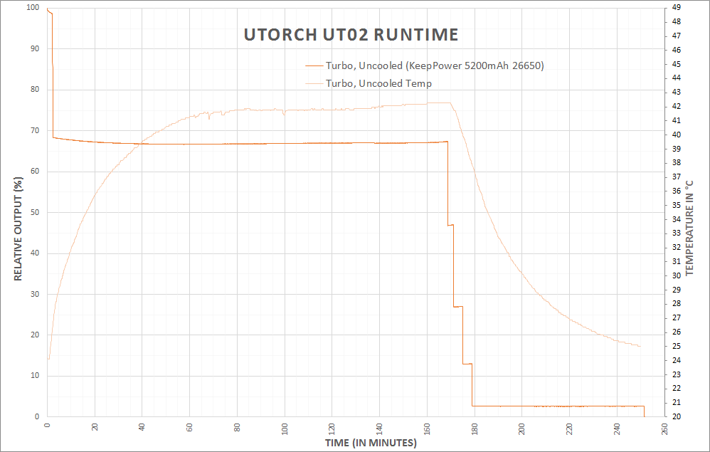 The light shut off at cell voltage of 3.03. I could continue to run the light at this point, but it was at a non-highest setting (approximately medium). The runtime was…. a little surprising I suppose. Claimed runtime on high of 1.25h, but I found a “highest” of over 2 minutes with a stepdown…. but the stepdown lasted for much longer than the remaining 1.25h. Credit to Utorch for the non-standard-skirting Turbo, and the stepdown steps down to a respectable 69ish percent, and is fairly rock solid for that nearly three hours.