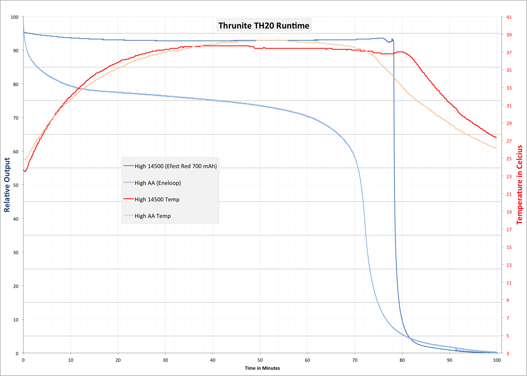 Furthermore, the Th20 does not seem to have any low voltage protection. High using the 14500 cell, cutoff at 0.46V. I primarily use an unprotected 14500, so the lack of low voltage protection is not not good. AA (Eneloop) cutoff was around 0.88V – I’m thinking Eneloops may have their own protection, tripping at around this voltage, because I’ve seen test after test with the Eneloops shutting off around 0.88V. I haven’t been able to confirm this, however.