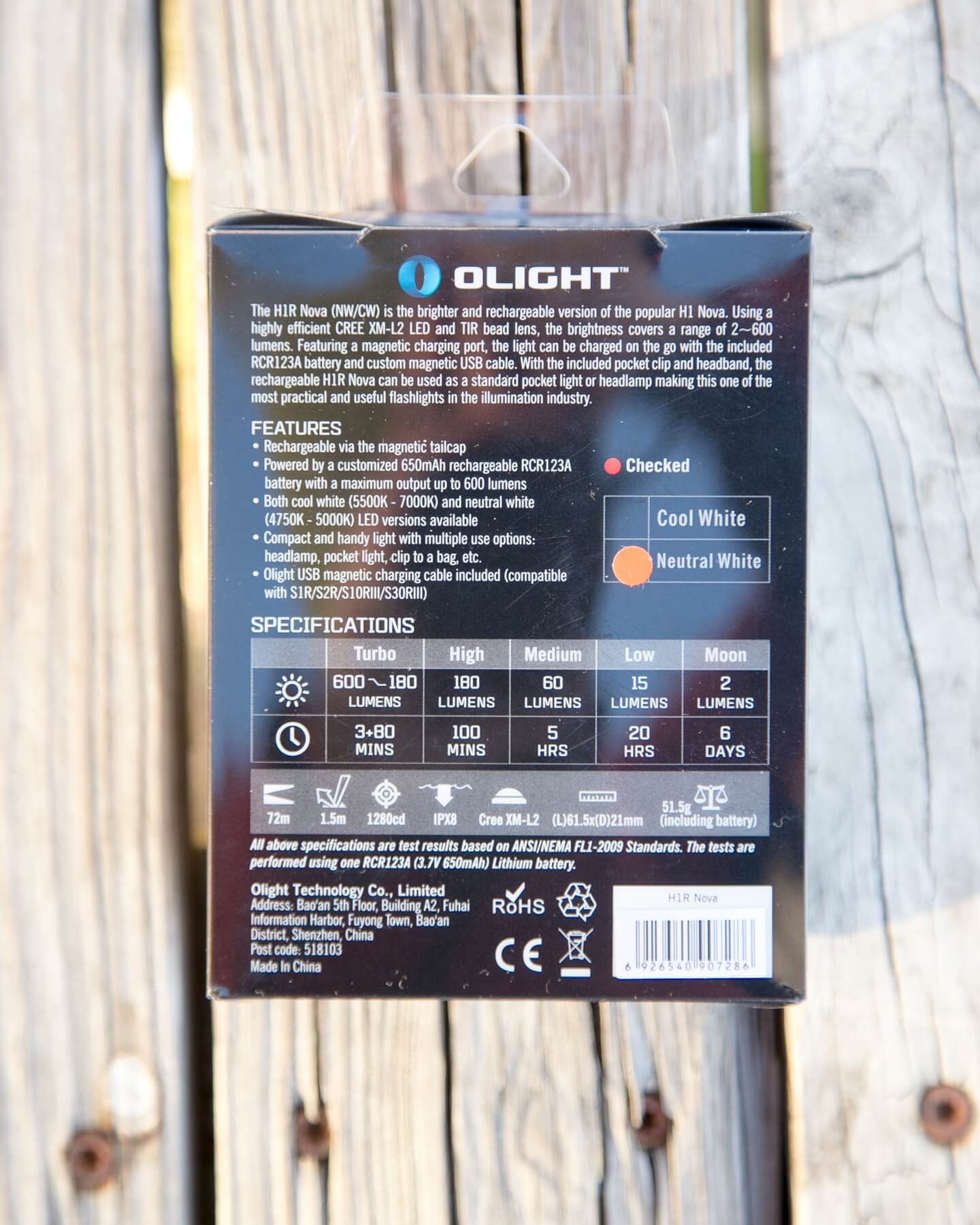 Getting it open is easy, but you will never, ever get things back in the package as they were from the factory. That’s not a bad thing; it’s just extremely efficient use of space. Olight packagers = Tetris masters. The box has a serial on the top, which matches the serial printed on the body of the H1R. Sides have a bunch of printed info, including the QR code.