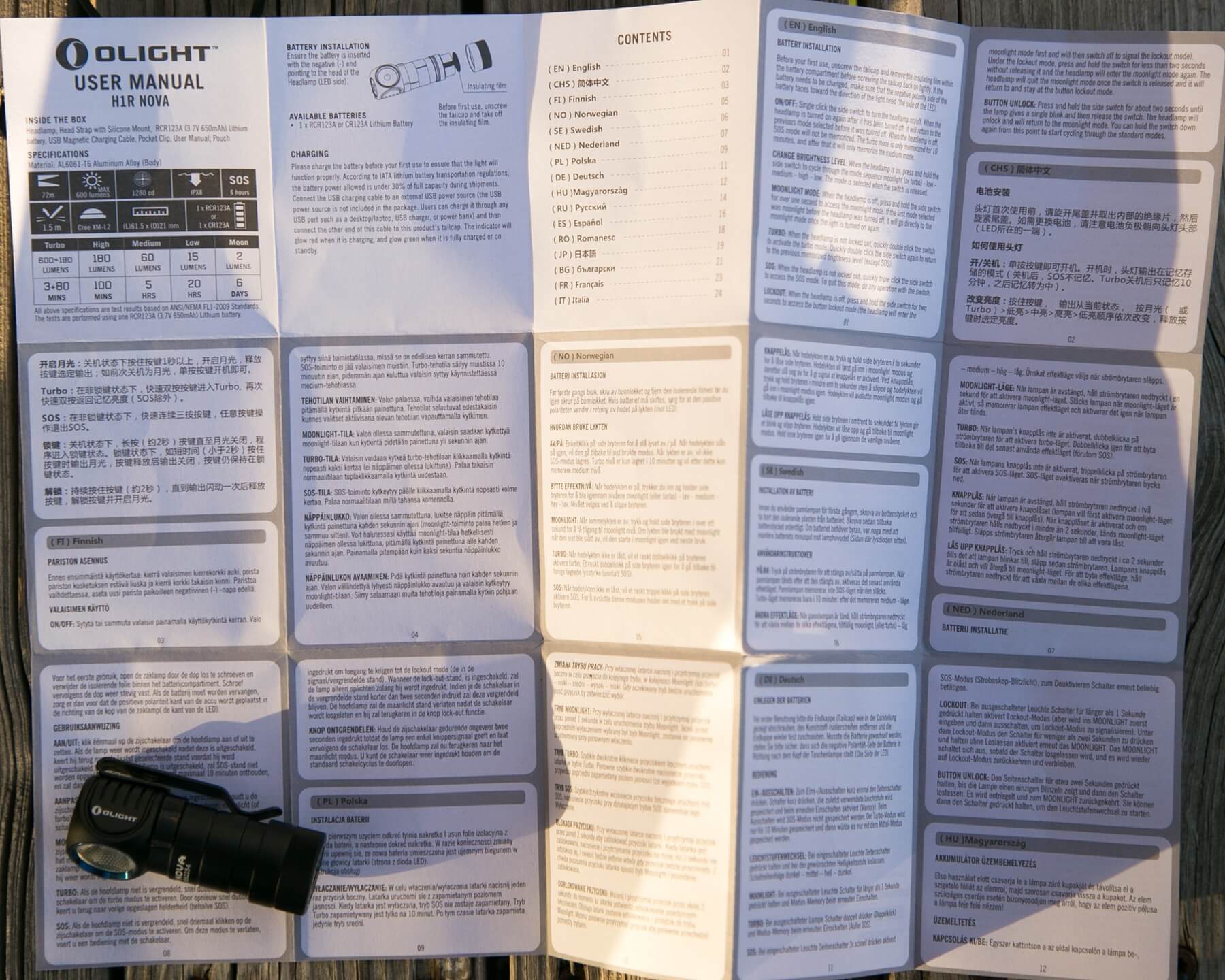 The manual again is typical Olight. One large sheet of paper, with individual squares having “page numbers” which don’t match any origami folding I could manage.