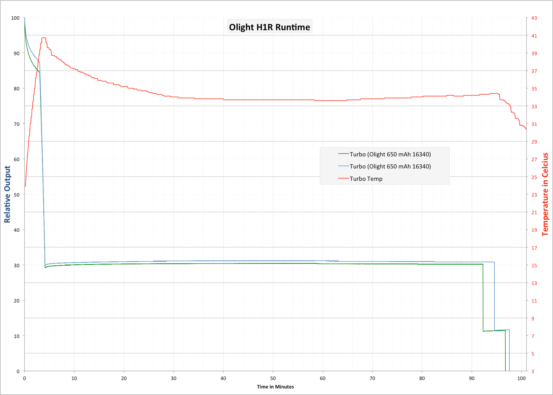 In my runtime test, turbo termination was at 3.28V. That’s similar to the H1, which further confirms that these lights are essentially the same, with only different tailcaps.