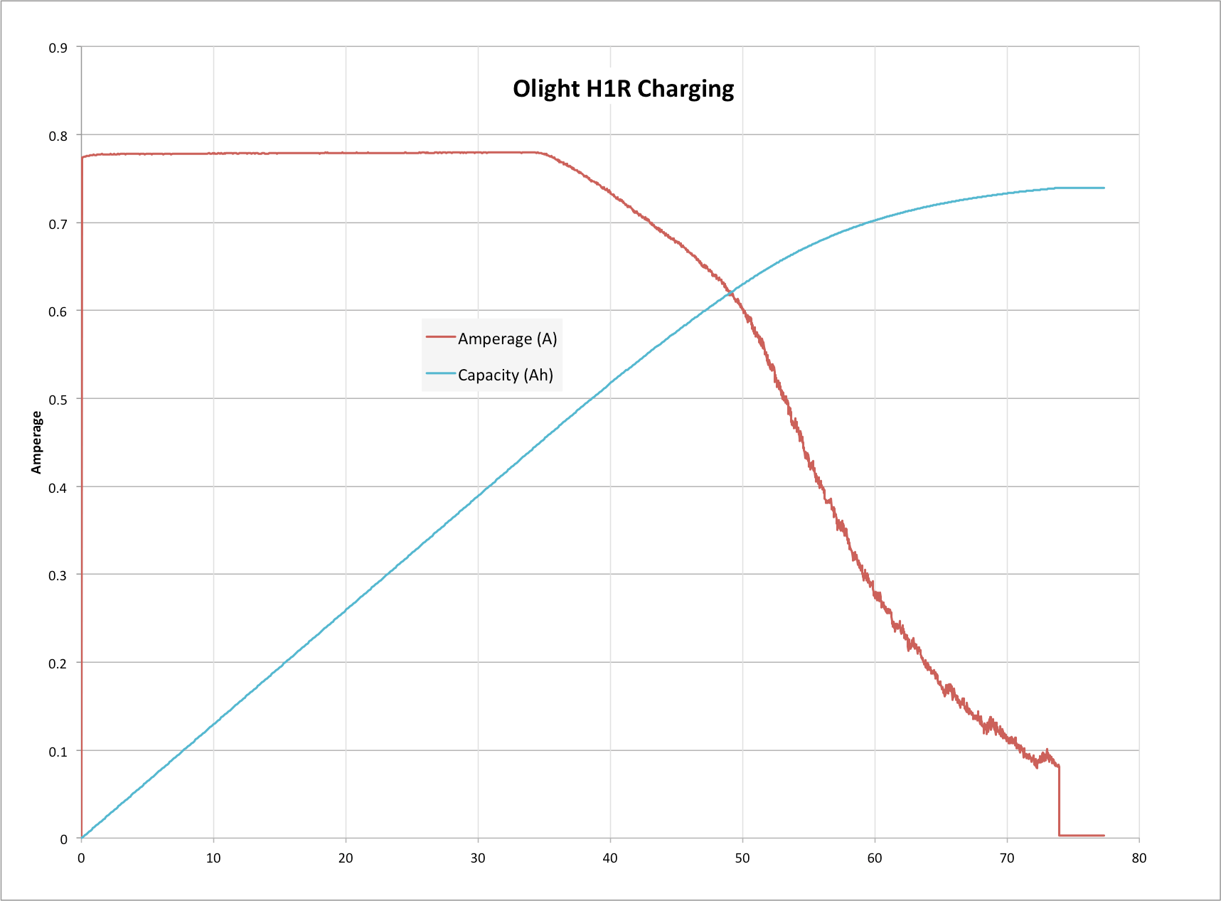 When using the base to charge the cell, charging terminated at 4.22V. Here’s a graph of that charge cycle.