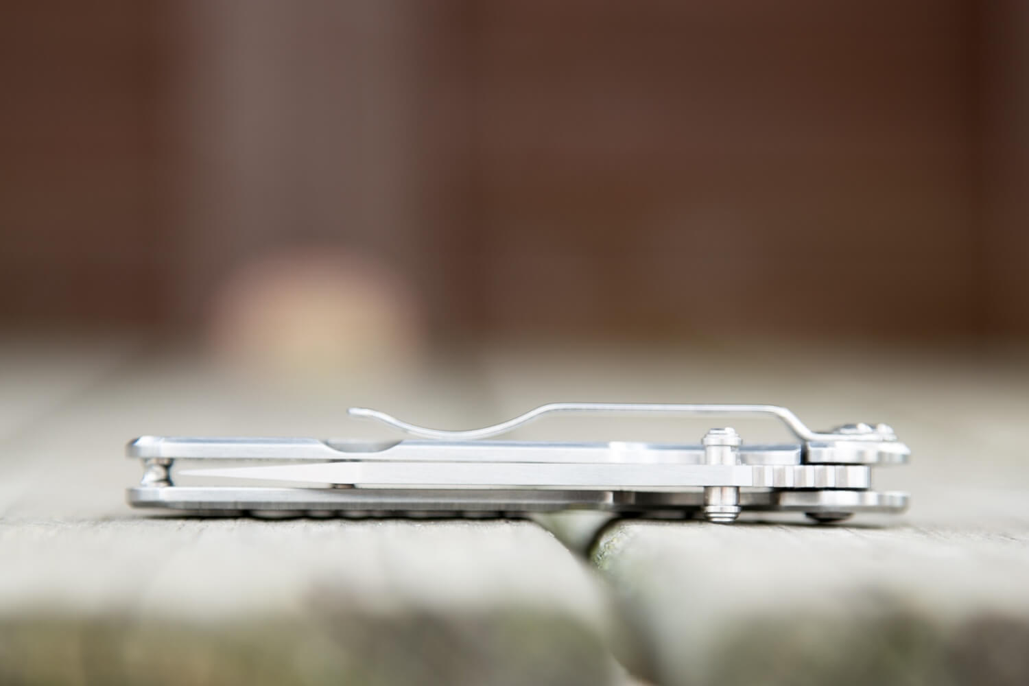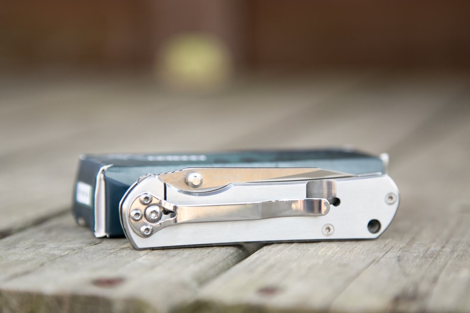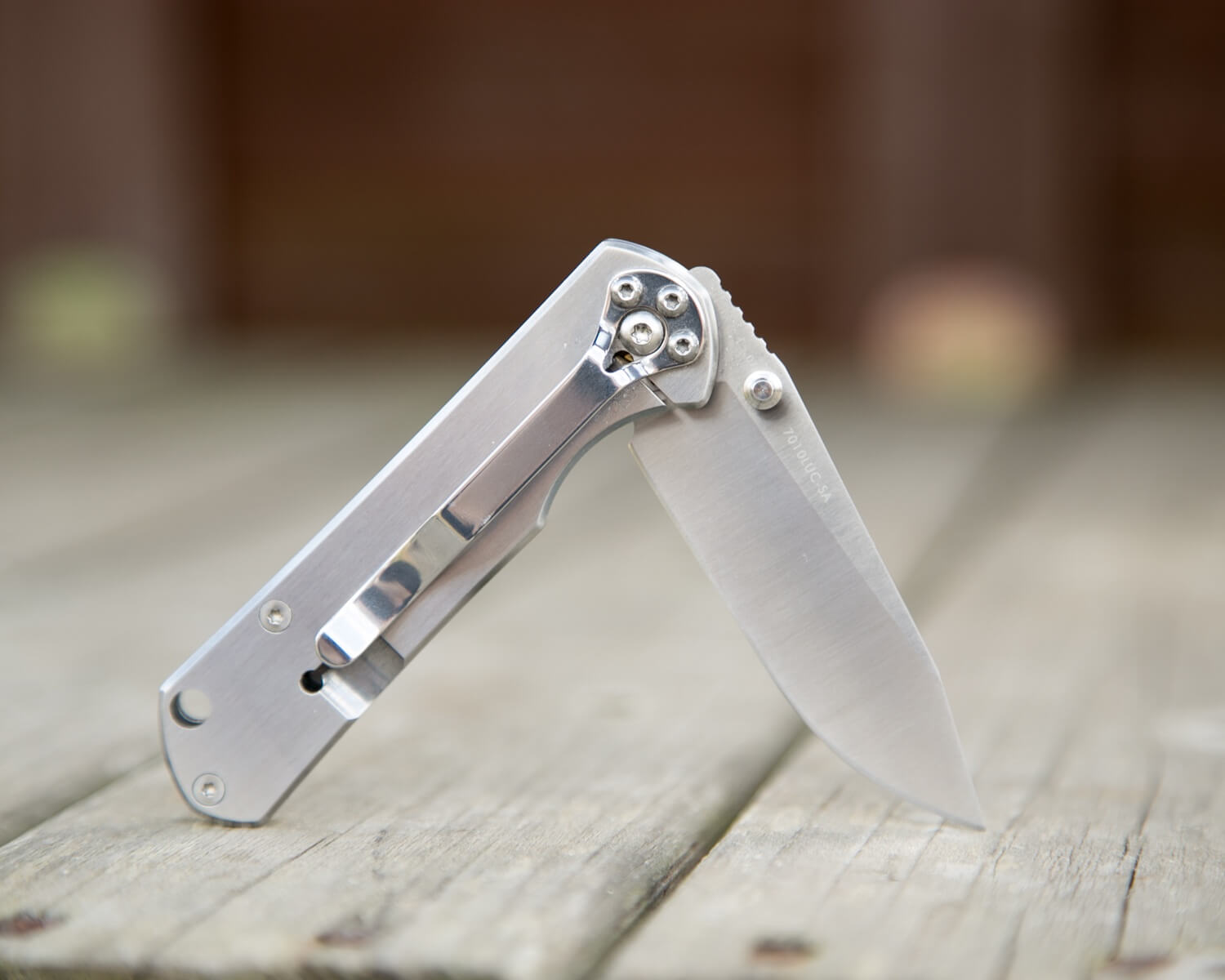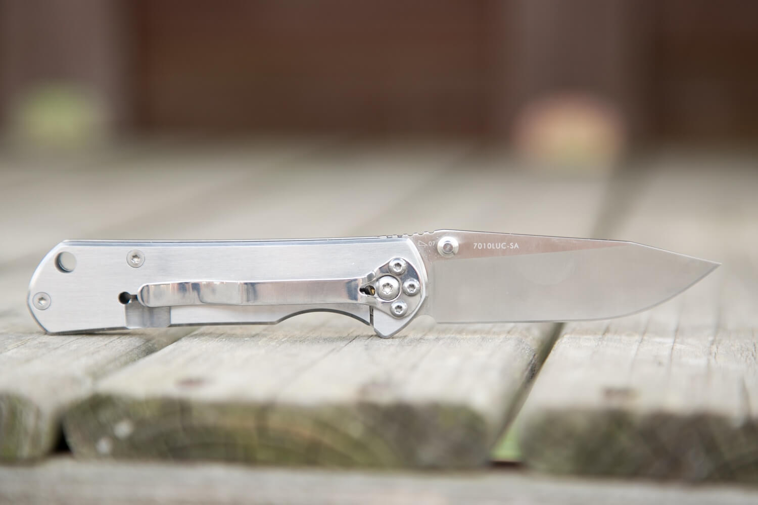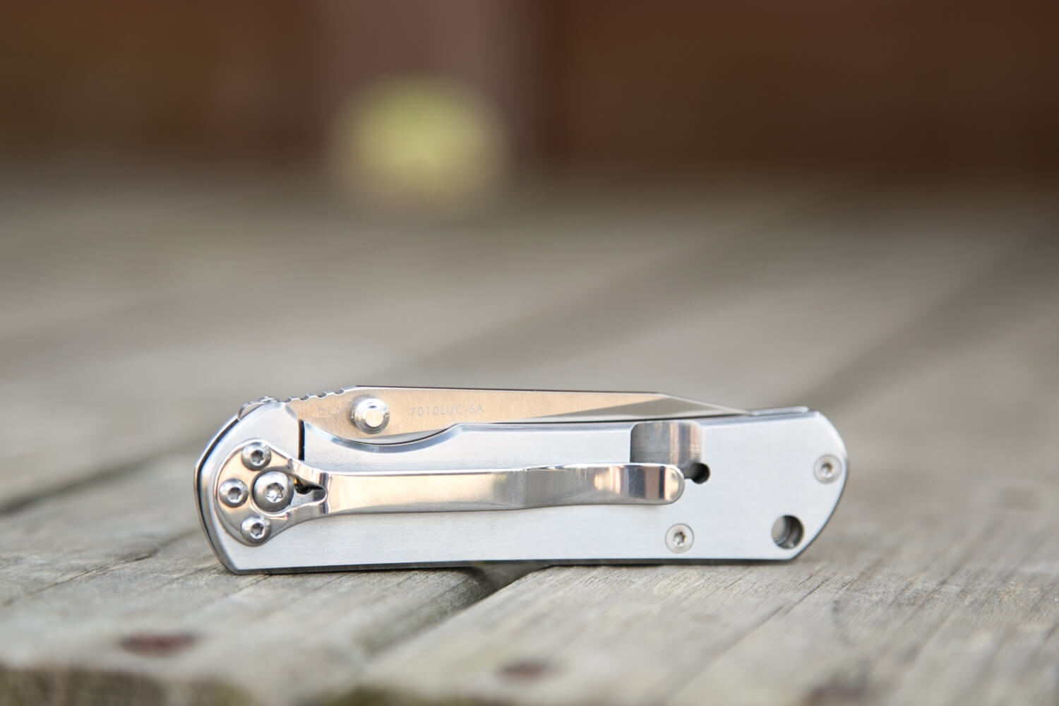 The pocket clip on the 7010 is installed at the factory, allows for tip-down carry only, and is not ambidextrous. That’s not my favorite thing about this knife, for sure, but I’ve become used to the tip-down carry. I’d almost prefer no clip and may end up carrying the knife that way. The clip may appear to be held in place by four screws, but it’s really just the three smaller ones – the clip has a cutout to allow the pivot screw to pass through. So the clip can be removed without disturbing the pivot screw.