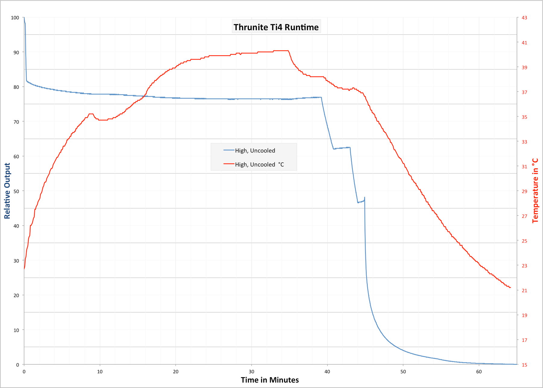 Two AAA cells don’t provide a lot of Ah, so we wouldn’t expect tons of runtime with this penlight. And that’s what we get really… Convenient light, but not for very long. Here is a runtime graph, on the highest setting.