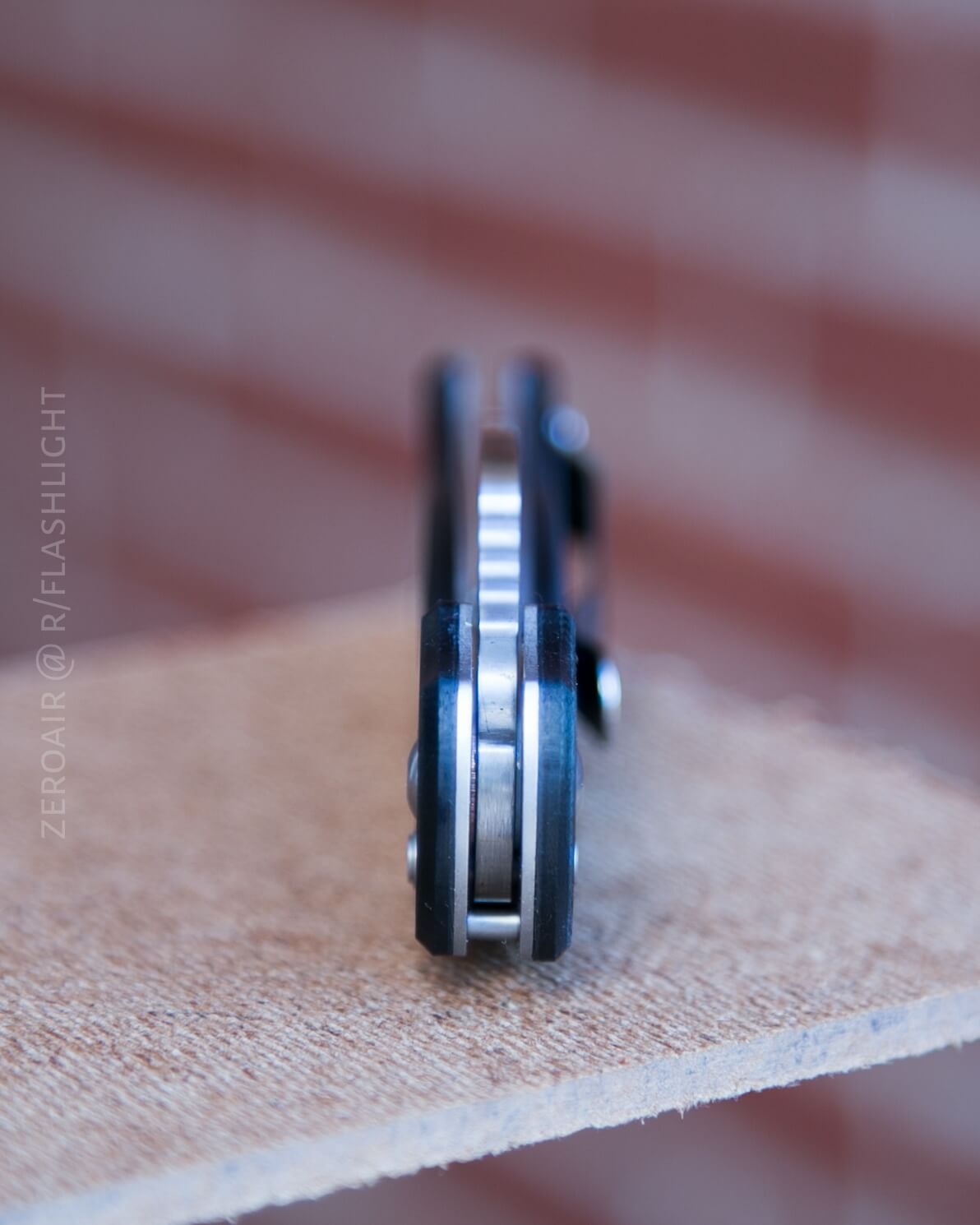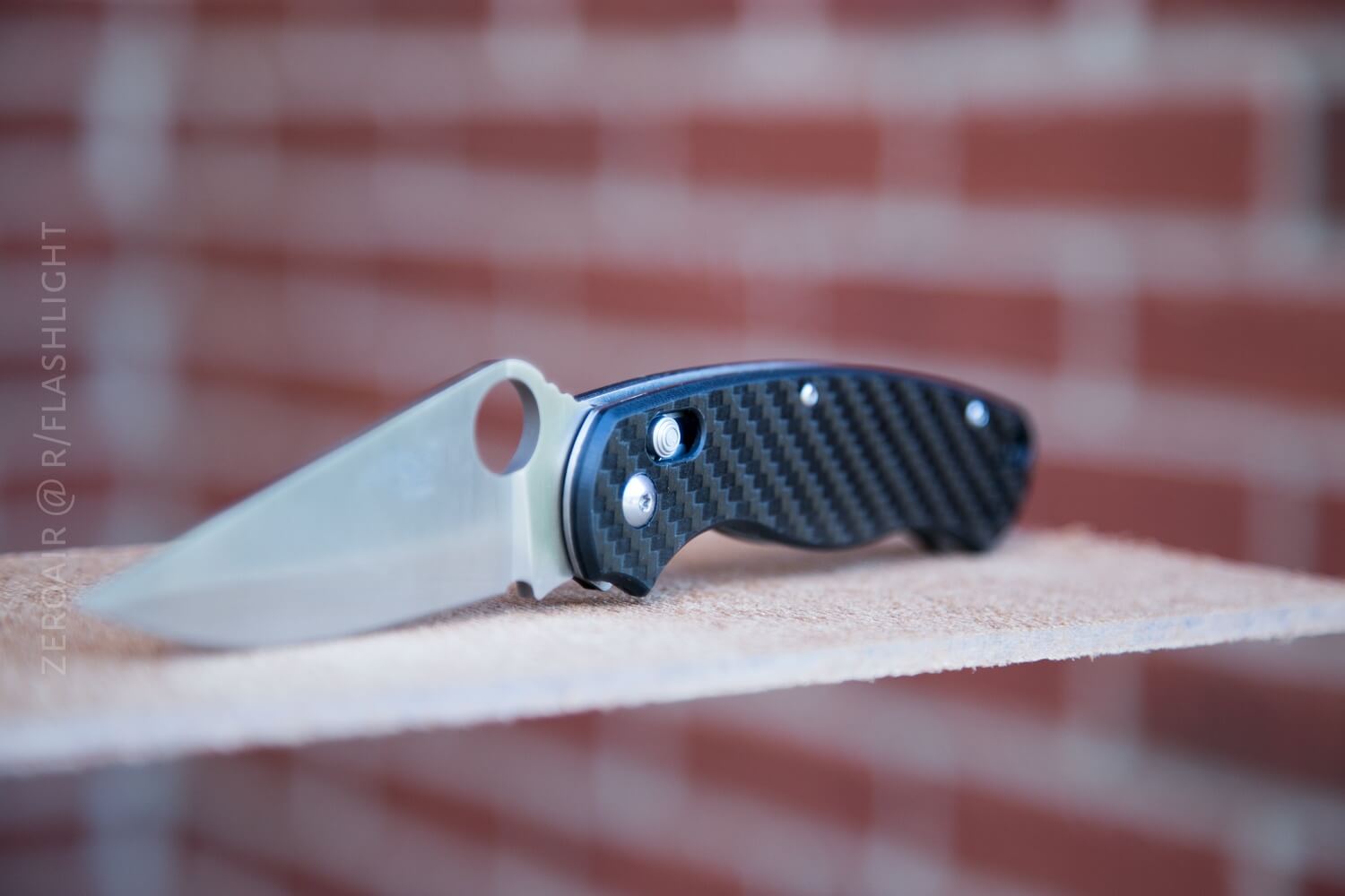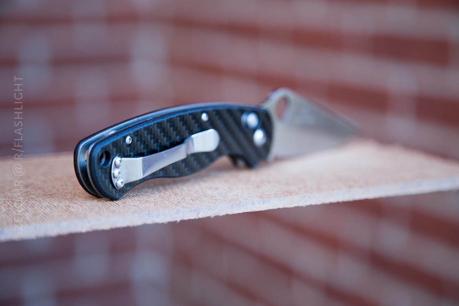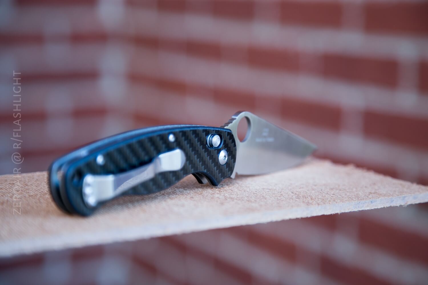 The monochrome and carbon fiber on this knife give it a great look. It could have a ridiculously good vibe if some of these screws or accent pieces were some other random color – orange maybe? 🙂