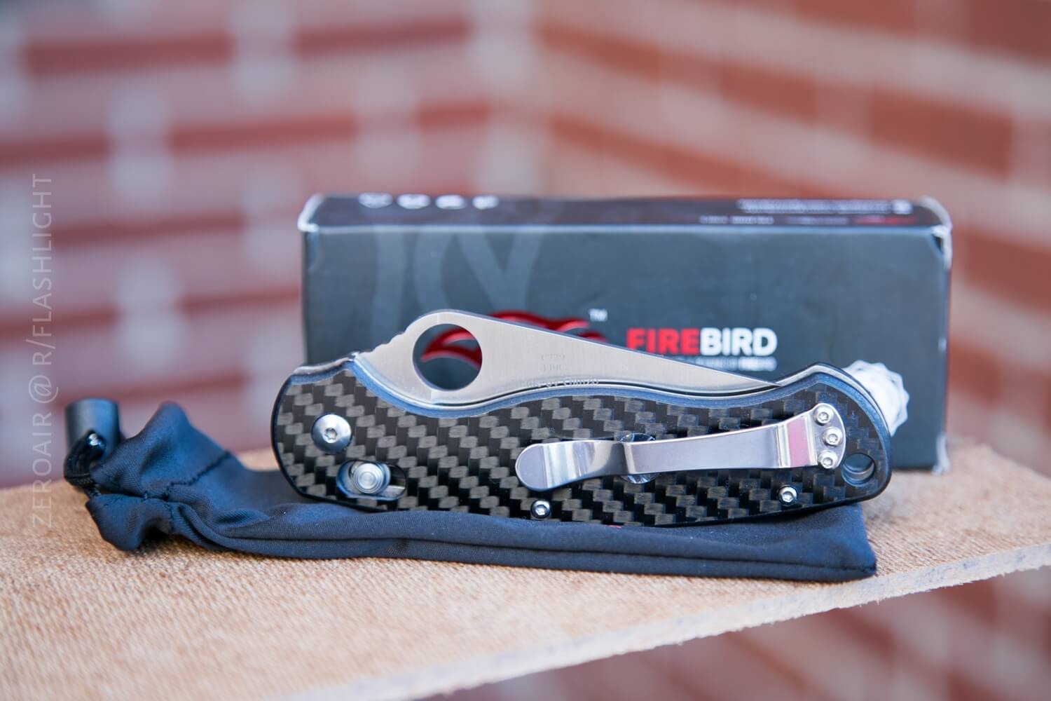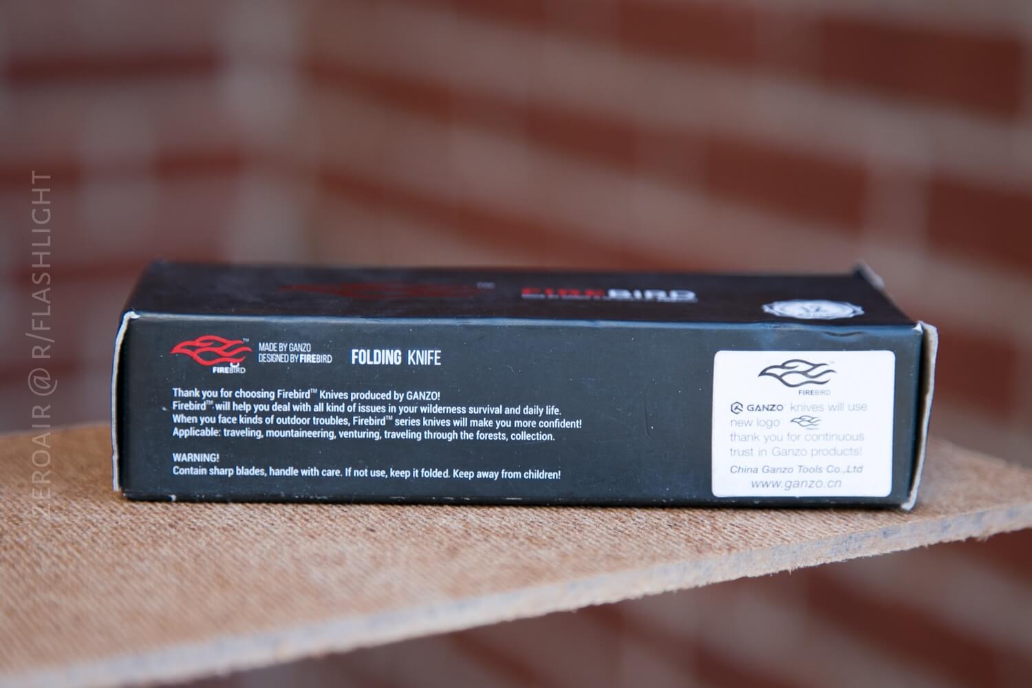 The package is like all Ganzo’s I’ve had. Black box, with a “tray” of sorts inside. The knife itself is held in a bubble sleeve, and there’s a velvet carry pouch in the tray too (but the knife is not in it!). The box has a bunch of printing, including the new (?) branding “Made by Ganzo, designed by Firebird.” And it also adds that this knife will “make you feel more confident” if I have outdoor troubles. I actually feel more confident already.