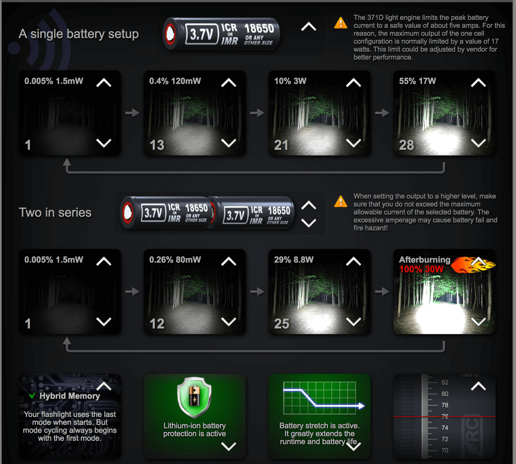 There are a number of power options. The BOSS 35 is powered by a single 18350. This configuration will allow programming up to and including the “17W” output. The BOSS 70 is powered by a single 18650. Like the 35, the 70 + 18650 will allow programming up to and including the “17W” output level. The 70 tube also supports 18350×2. This configuration allows a few higher outputs than the single-cell 17W setups, thanks to the extra voltage 2 cells provide. Here’s a handy photo of the modes and the extra modes allowed by the 2-cell configuration.