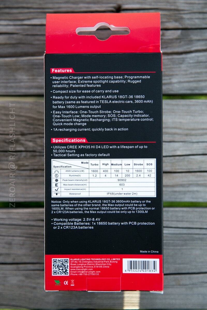 Klarus has stayed with their standard packaging here. This is a nice, display-ready package with a hangtag and a window into the light itself. The box is quite descriptive and printed on all sides. The back has features and modes, and quite a lot of useful information.