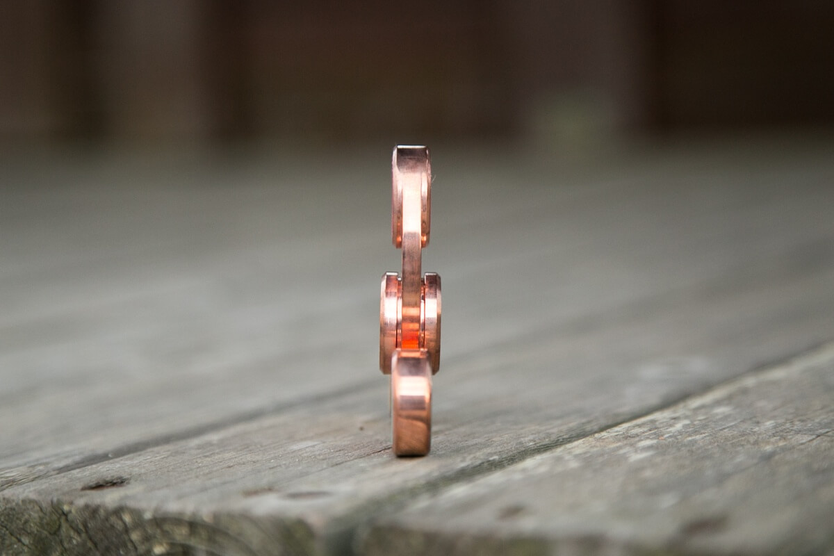 There are a number of versions (metals) of this spinner. This one is “red copper.” I’m not sure what “red” copper is, but this one does have the weight of copper. And though it doesn’t seem to be tarnishing quite as quickly as bare/raw copper, it also does smell like copper. There’s also a “yellow copper”, among others.