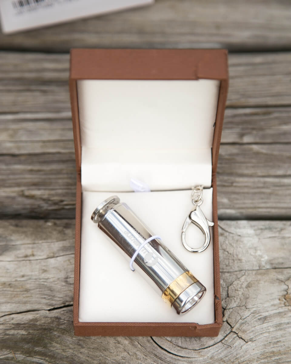 This little Lumintop Torpedo 007 actually looks like a little torpedo, but it is a flashlight! It uses a Cree XP-L HD emitter and a 16340 cell.