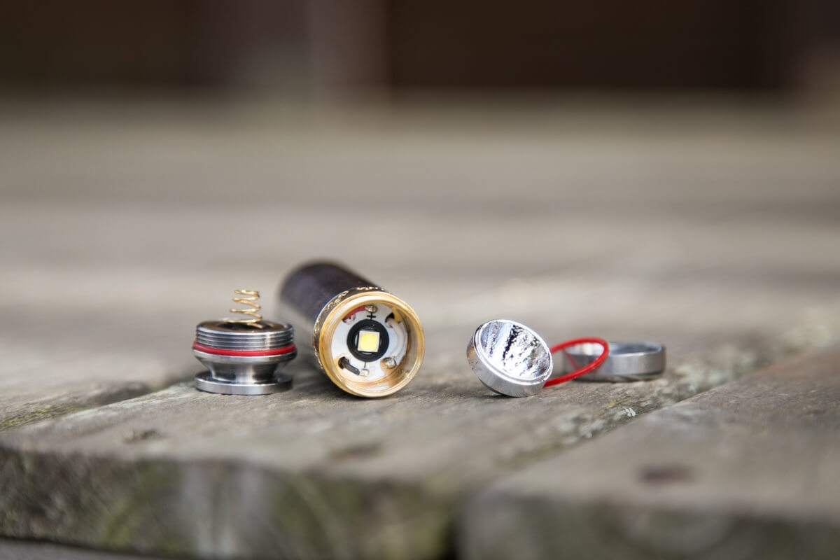 It’s fairly easy to take the light apart. The bezel, though smooth, can be removed. The reflector comes right out, allowing access to the MCPCB. I didn’t take it apart further, though I did try to unscrew the “flame ring” and had no success. You can also see that the tail has a spring, but the head has only a donut. That donut doesn’t cover the brass button, so flat or button top cells should work. I tested both protected and unprotected, and all worked.