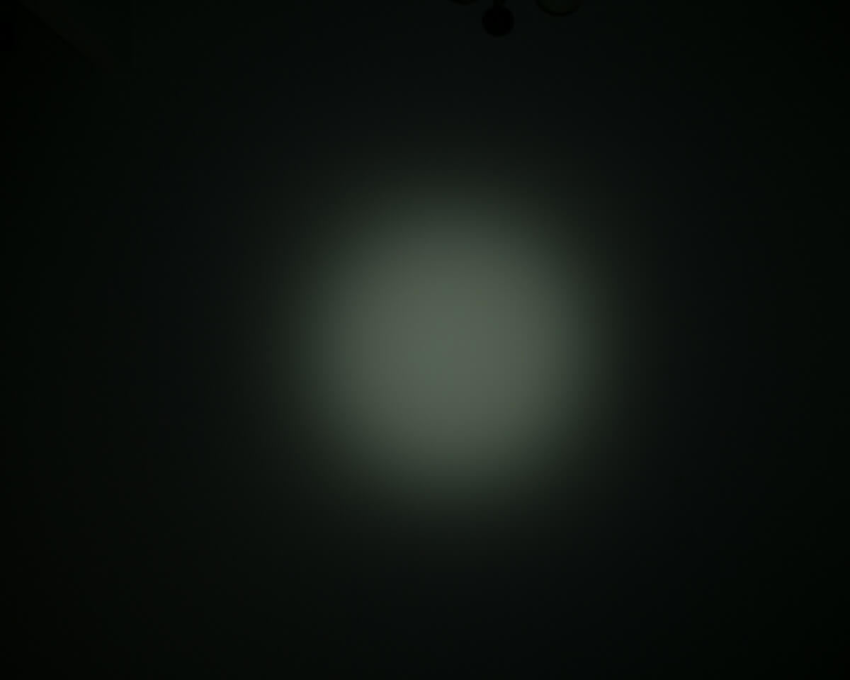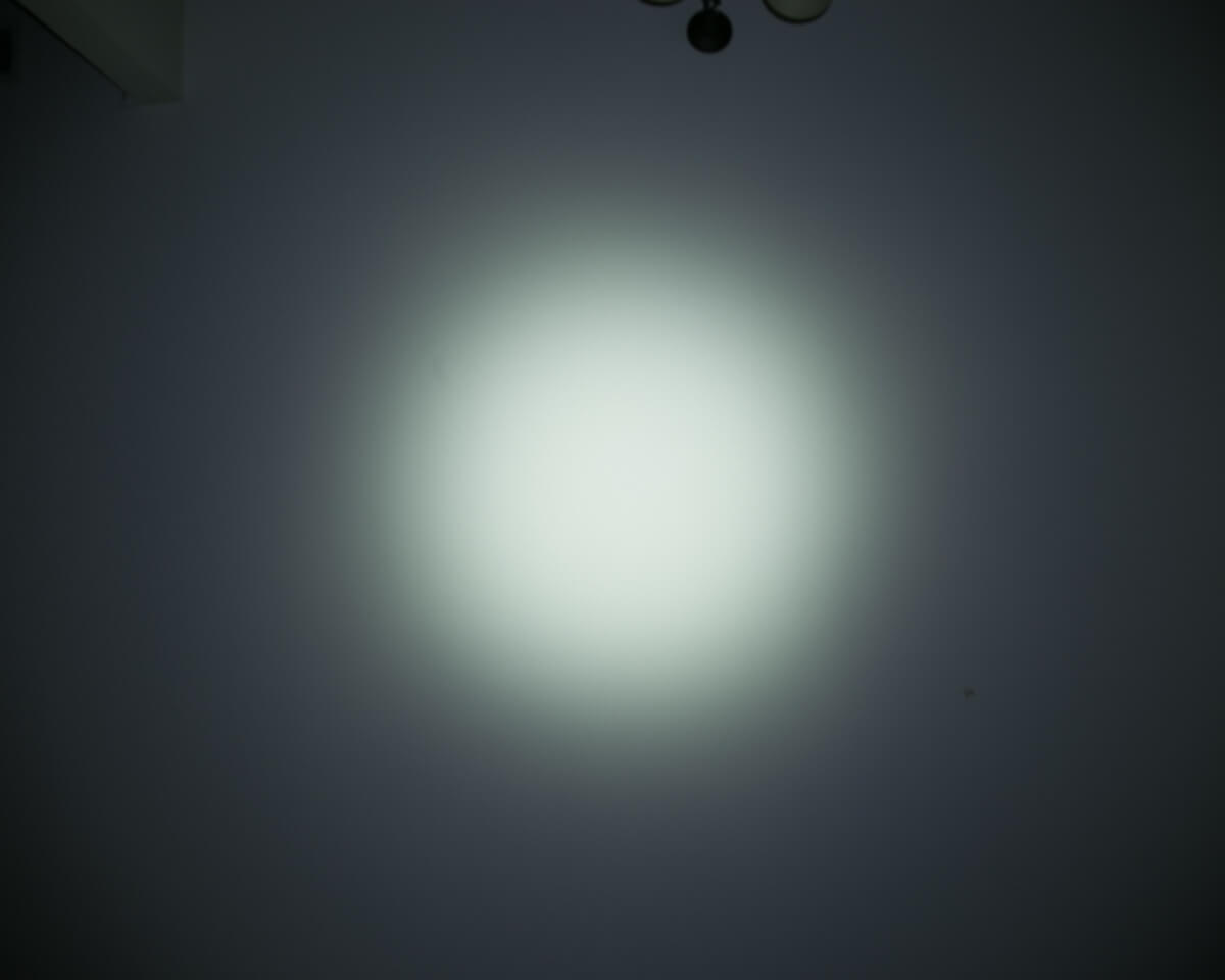 The emitter here is a Cree XP-L V5. The emitter sits behind a lightly orange-peeled reflector. The reflector isn’t very deep. The beam has a broad spot but not a ton of spill – it’s actually similar to a TIR (which I love) except for the small bit of spill.