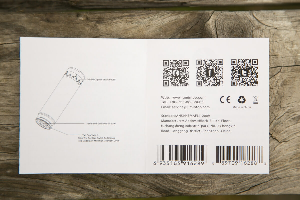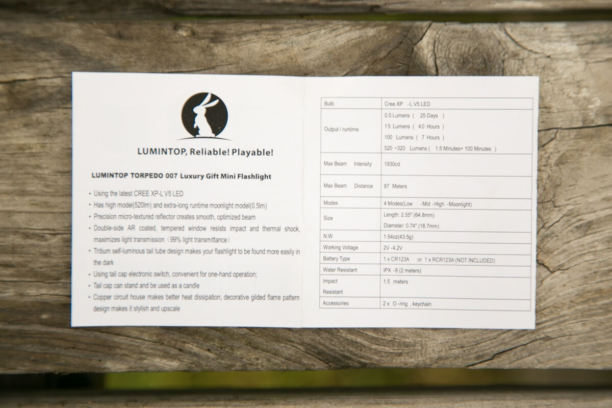 The manual is very simple. There are some specifications listed, and mostly it’s just specifications. The user interface is described. As this is a very simple user interface, it’s not incredibly wordy. In fact, it says simply “Click the tail cap switch to change the mode (Low Mid High Moonlight Circle)”.