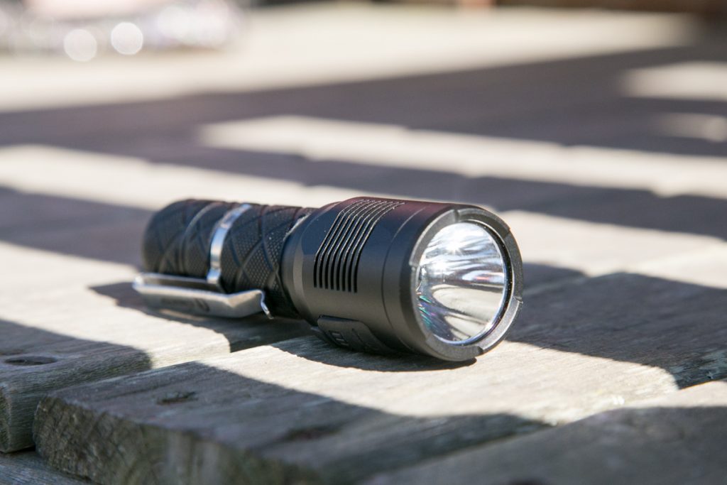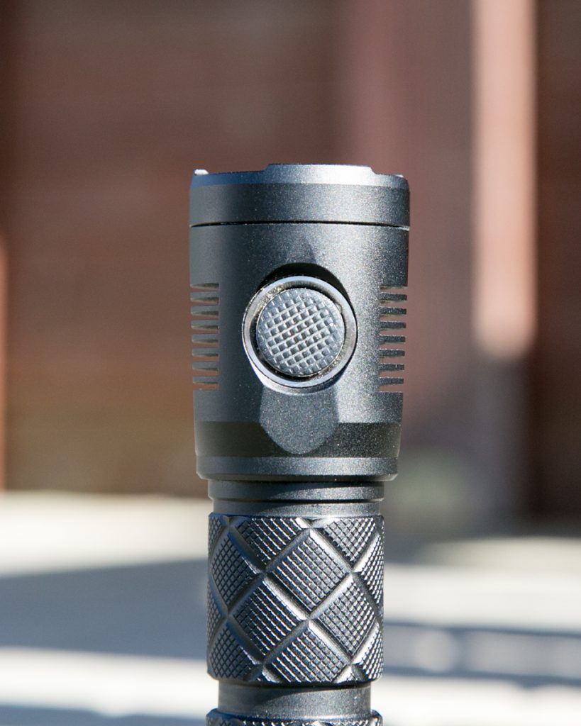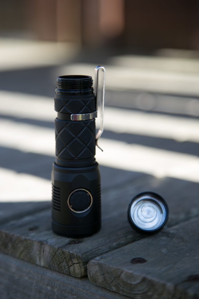 I can lead this section by saying: I’m extremely pleased with the build of this light. I love it, in fact. I love the diagonal knurling, I love the size and shape… This is a nice-looking light. And it feels like great quality, too. The threads are thick and square-cut, and also nicely lubed. The knurling provides great grip without being too aggressive and also provides a nice somewhat unusual look. The clip is simple without feeling cheap. The reflector is deep and aberration-free. The switch is a nice knurled rubber switch, with dual indicating LEDs underneath.