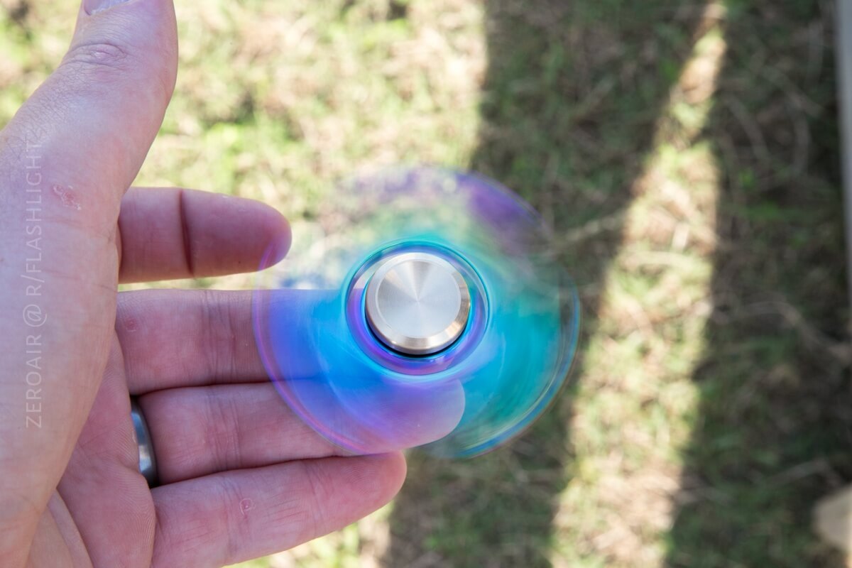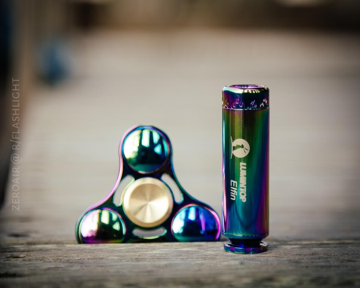 Of course, this spinner is stunning – you can tell it by the pictures. But in person, it’s just as stunning. The thing is ridiculously shiny and iridescent. Well, not quite officially iridescent, but the coloring is fantastic. In fact, it’s the same coloration as on the Lumintop Elfin (of which I will have a review soon in the next day or so.) That’s described as “electroplated” stainless steel – I’d guess this spinner is the same thing. Their finishes really look exactly the same!