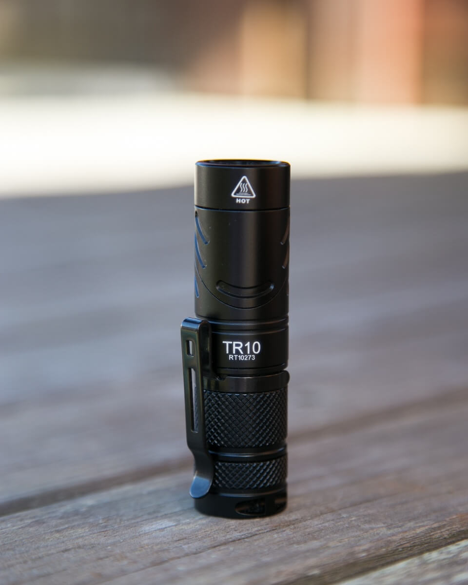 The TR10 comes with a pocket clip installed. This pocket clip is probably my biggest gripe about the light. The clip is nearly in the center of the light, which makes the light very unbalanced when clipped in a pocket. This clip also interferes in a frustrating way when reinstalling the tail cap. The end of the clip deflects the tailcap just enough to make screwing the cap on to these unanodized threads sketchy.