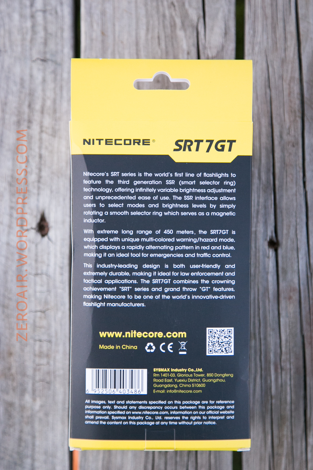 Very typical Nitecore packaging here: Yellow and black packaging on a cardboard box which is highly printed and has quite detailed info. Featured prominently on the box is the “5 year warranty promise”. There’s also a QR code and some nice photos.