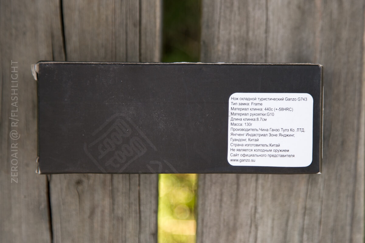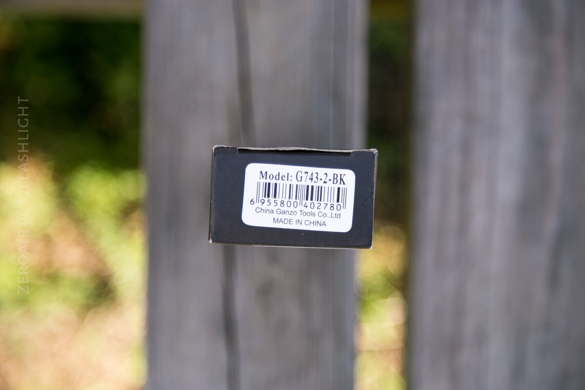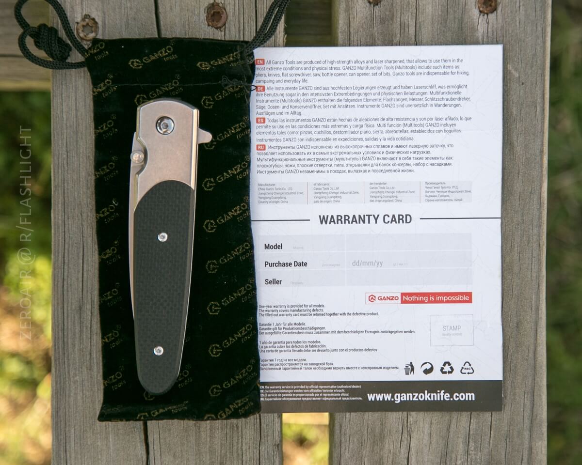 A more or less typical Ganzo package: a slip fit box with some light branding, and a Gearbest inventory sticker. It’s a fine package, and the knife is protected well.