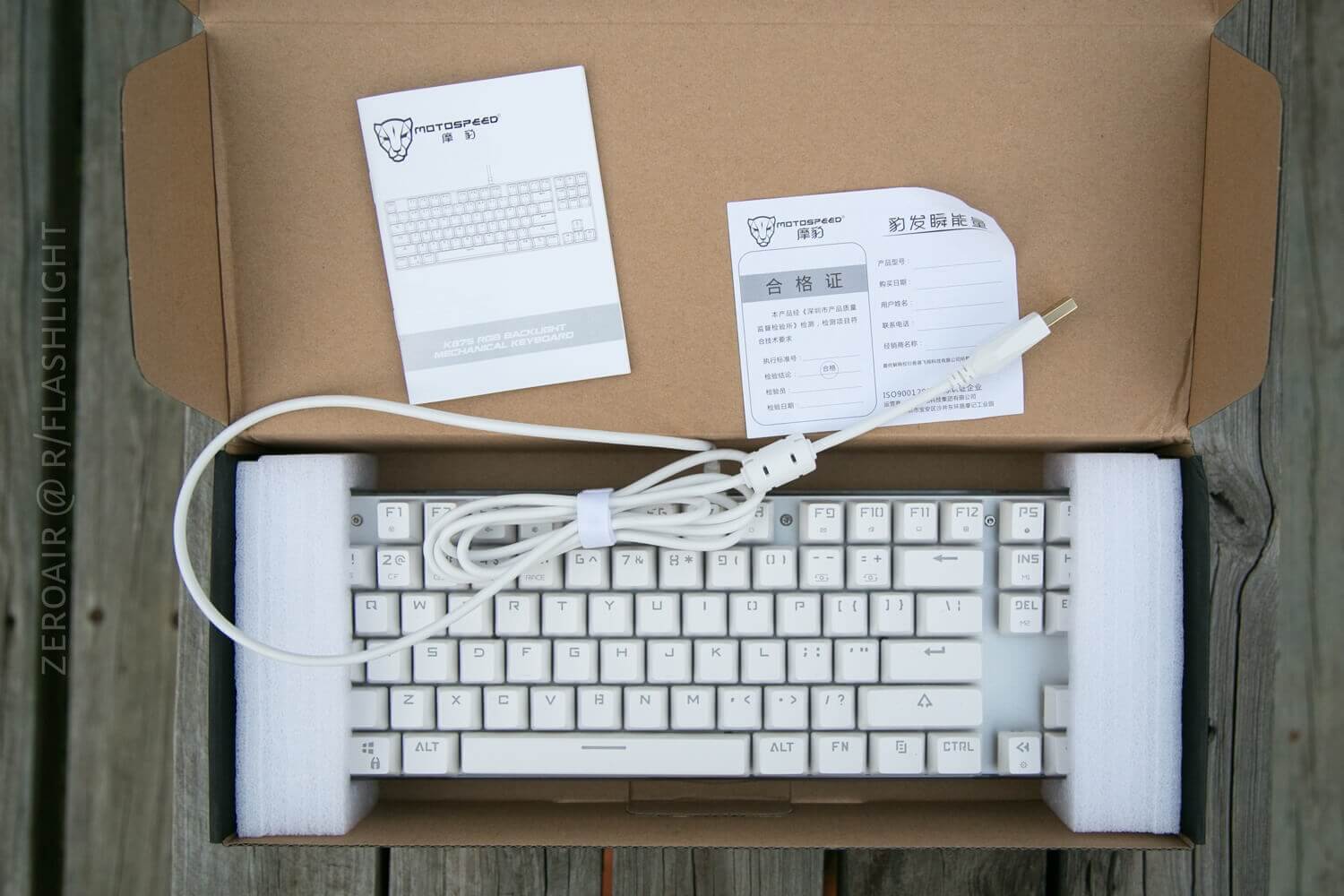 As with the Motospeed CK104, the K87S ships in a protective corrugated black box. It’s nicely embossed with the Motospeed logo, in red. It’s a fairly typical keyboard box. Inside, the keyboard is suspended by foam on the ends. The bottom has a plastic cover, and the whole keyboard is in a plastic bag. The cord has its own.