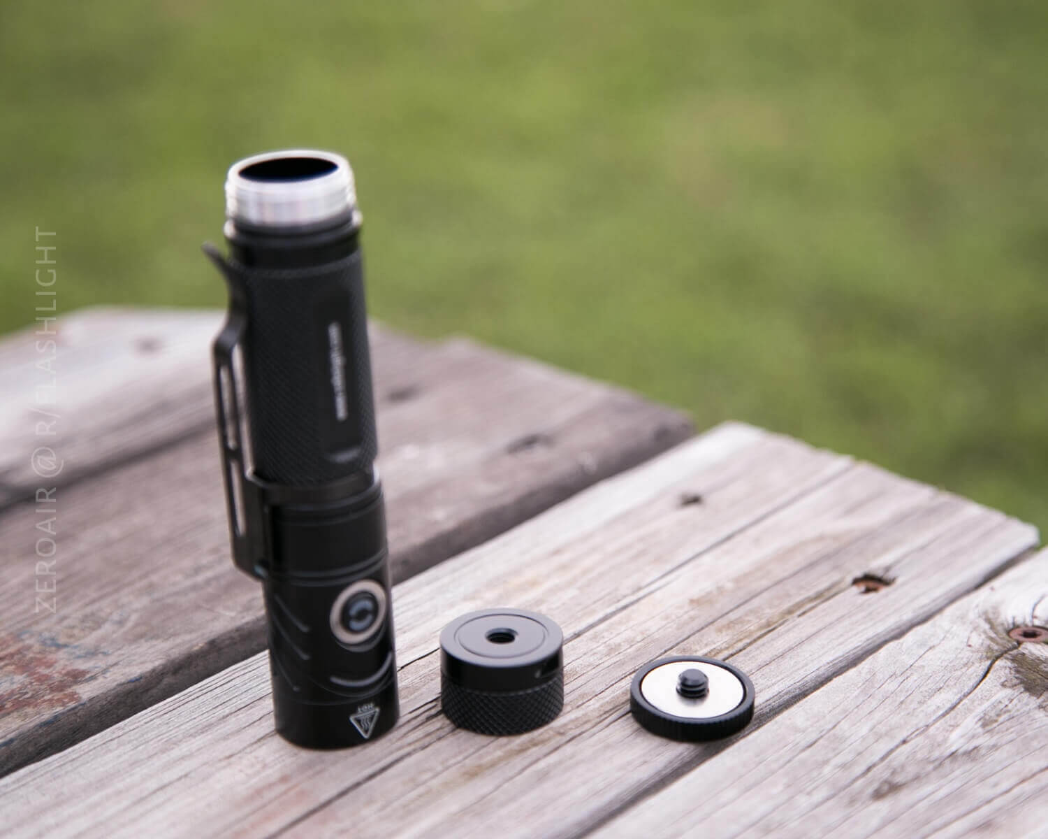 Unlike the TR10, there’s no magnet in the tailcap. There is, however, a 1/4″ threaded connection for use on tripods in the tailcap.