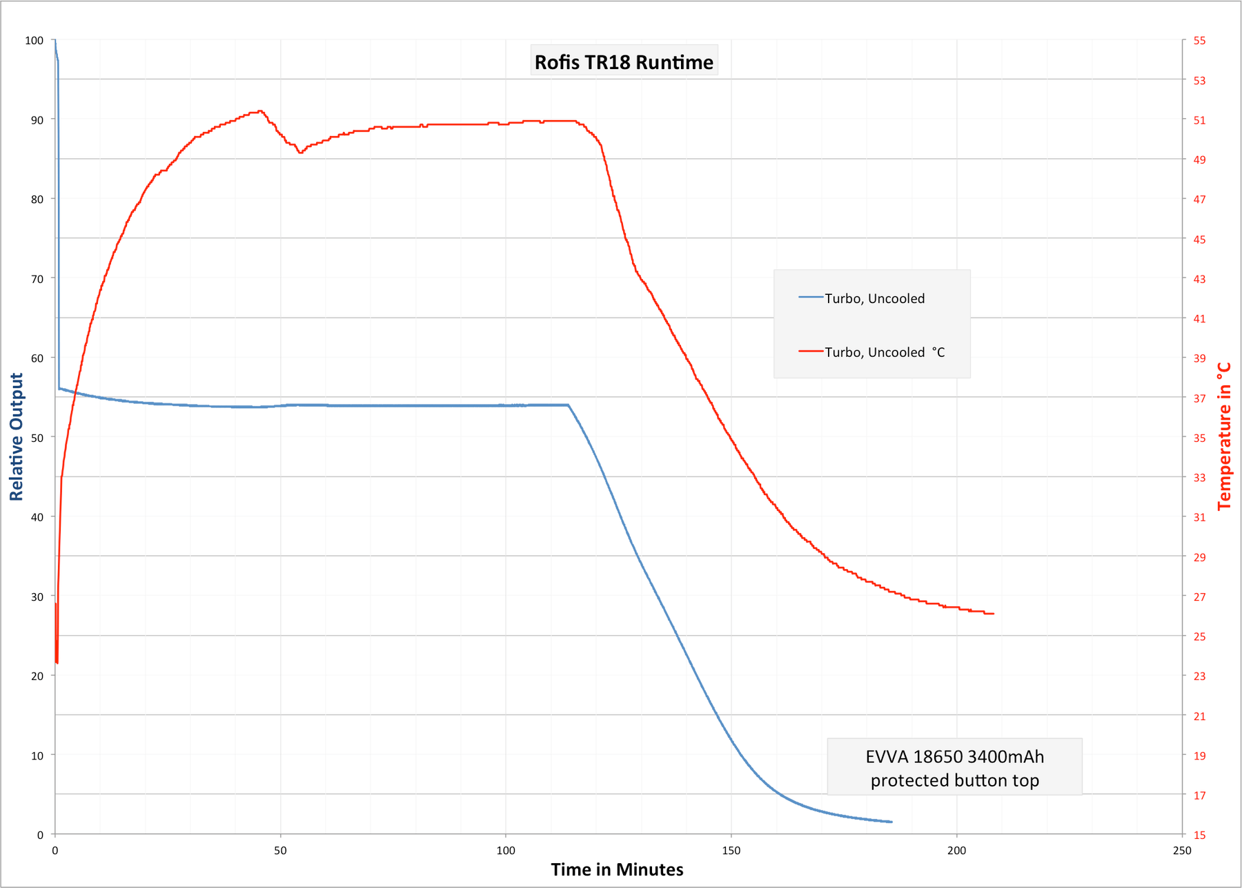 The Turbo runtime terminated at 2.56V – soft termination at that. Output was very minimal, and the indicating switch was red. But it was still outputting light.