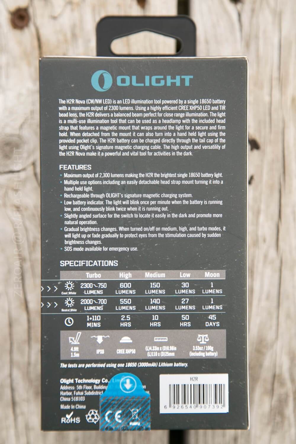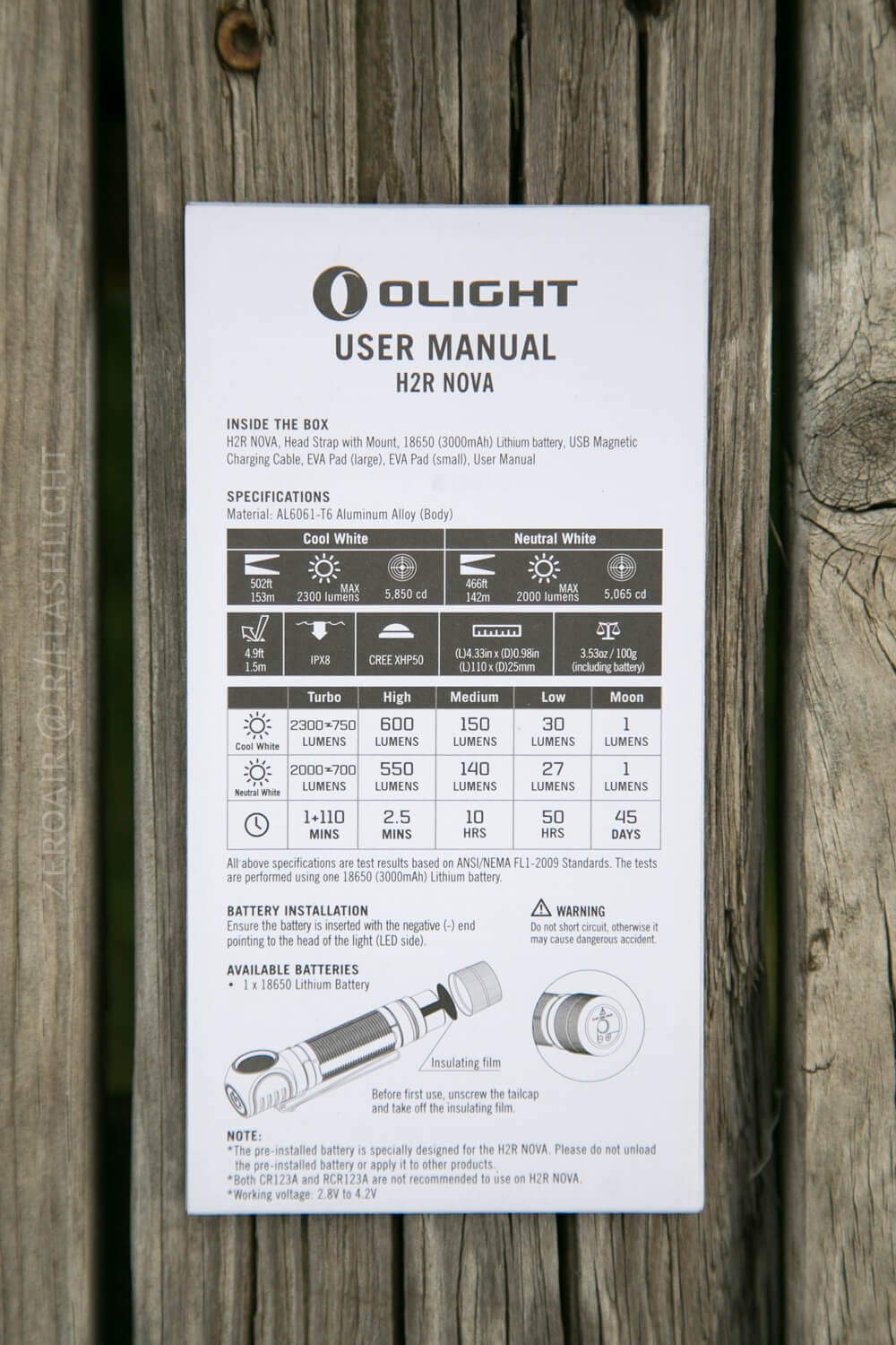 The H2R uses a single 18650, which is included in the package. (On first use, you’ll need to remove the plastic ‘during-shipping’ protector.) This is a high-drain cell. I have no complaints about the cell.