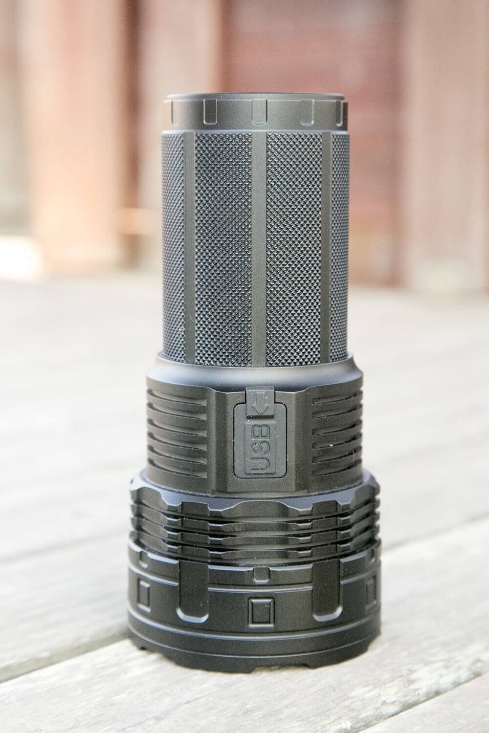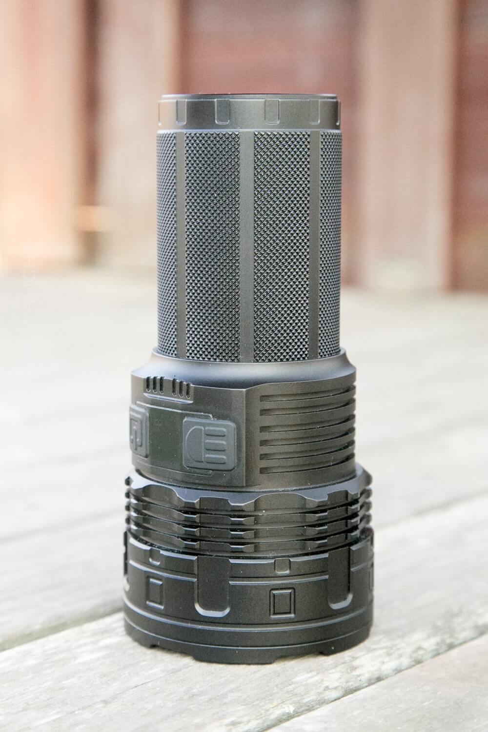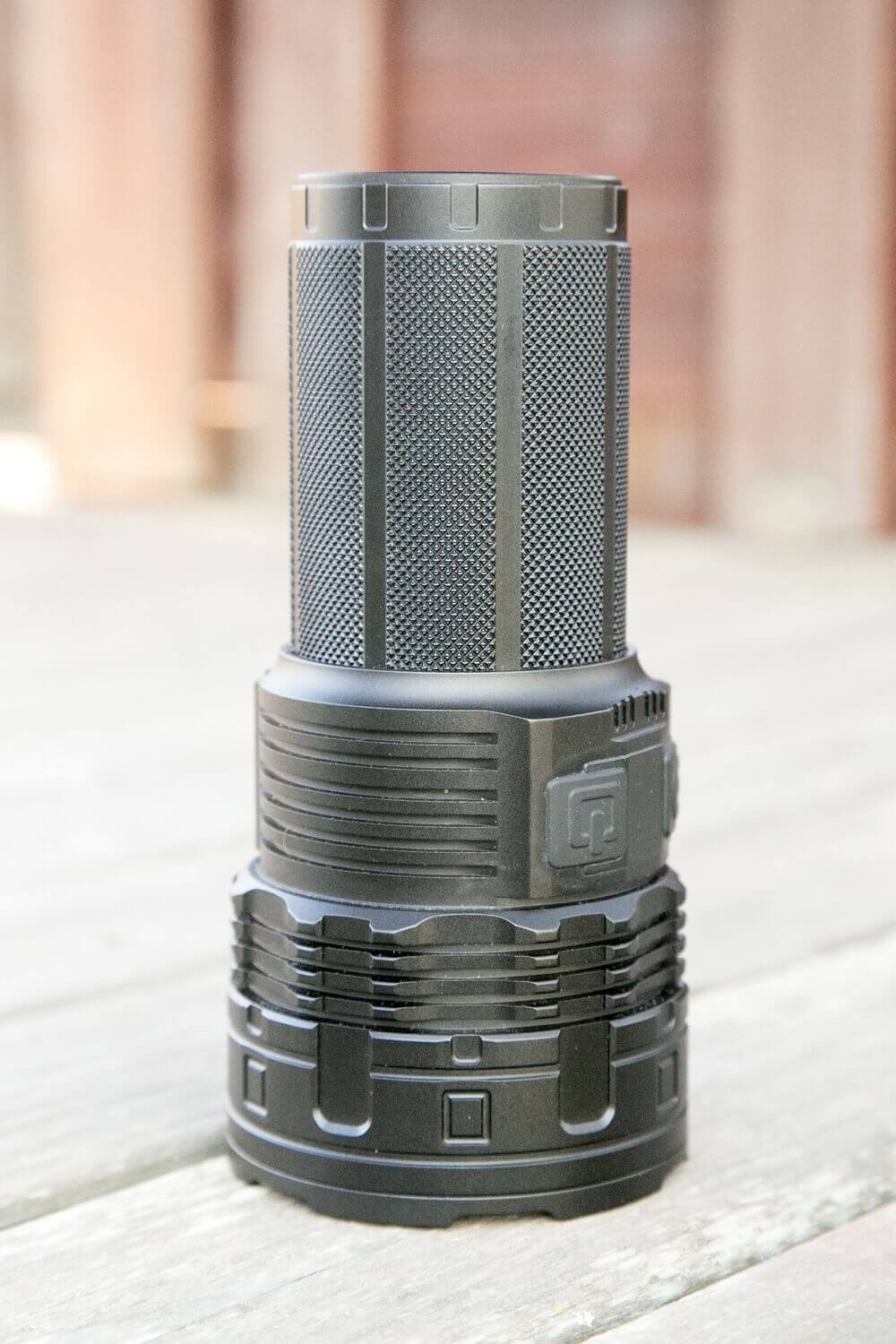 It’s a looooot bigger than the smaller, single-emitter brother, the DN70. These lights aren’t really all that dissimilar – the DT70 being nearly four DN70’s strapped together. But the DN70 uses a single 26650 and an OP reflector, and the DT70 uses four 18650s and also has OP reflectors. So they’re similar, generally.