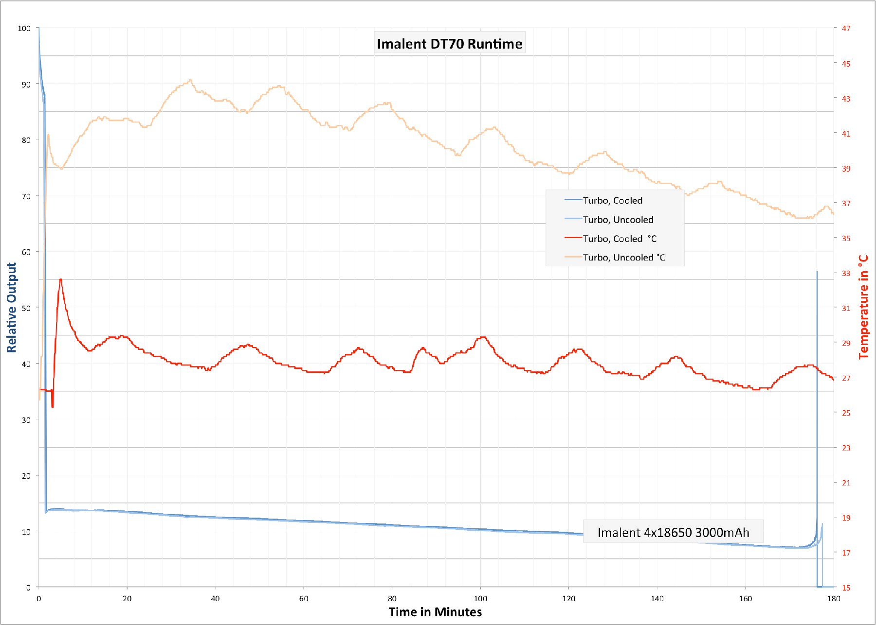 I did a runtime on turbo. Note that this light is so bright that I had to do a nonstandard test. But the relative output is still accurate. I used the provided cells on Turbo with no cooling. Terminating voltage was 2.95 for all cells – light shutoff on its own (ie, it has LVP). Then I did a runtime on turbo with cooling. Note that the output is practically exactly the same, without regard to temperature.
