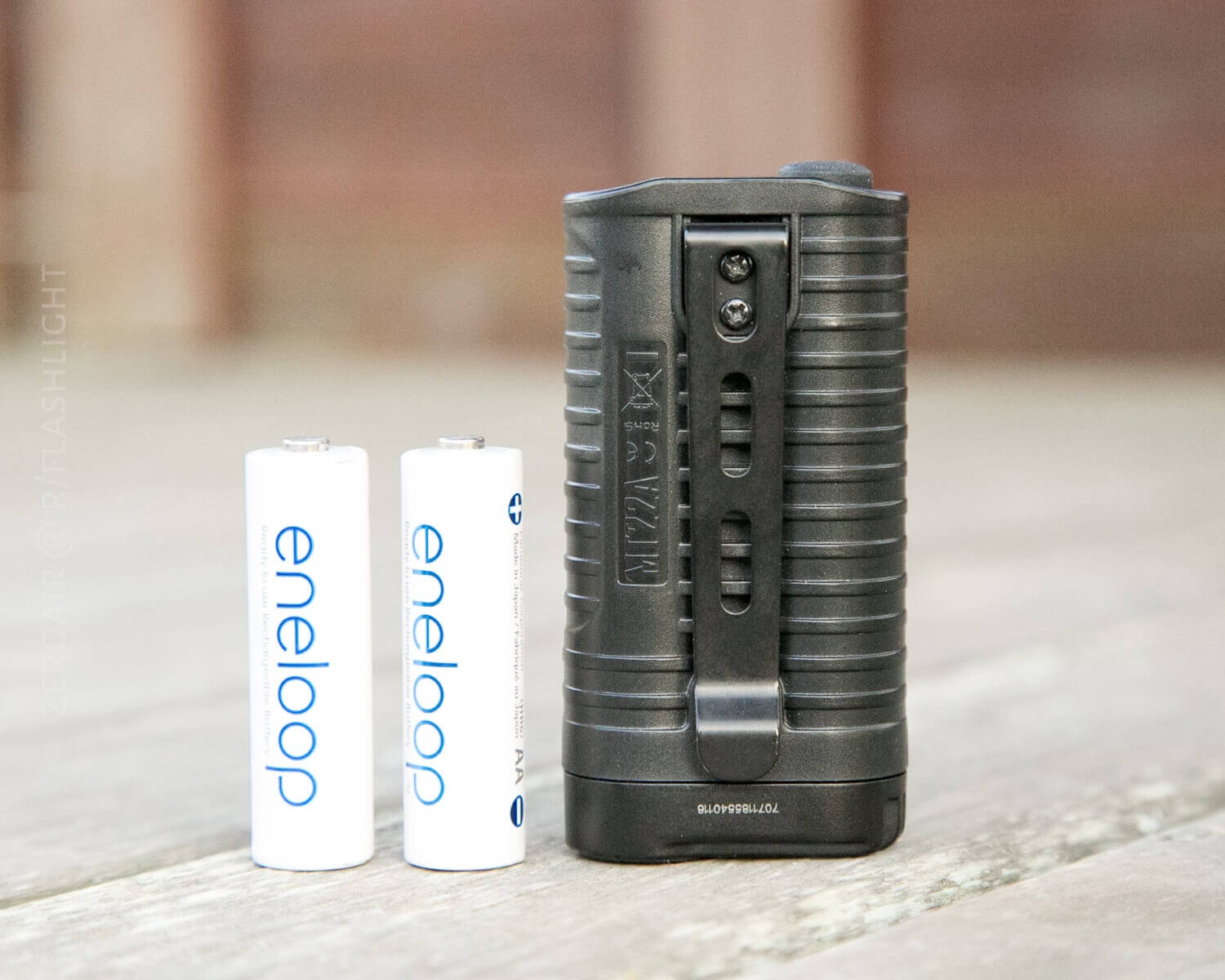 The MT22A is powered by two AA cells. The manual does not mention Li-ion support, but primary AA and rechargeable AA are good to go. All my testing was done with Eneloops. The tubes are directional, with mechanical reverse polarity protection; the cells will only work in the correct direction. That is, they work with the positive terminal toward the button, and the negative terminal toward the spring, on both sides. The cells will be opposing each other. I find that when putting the head back on the light, one must depress the ‘release’ button. I expect that’s by design, which means the head is essentially locked on. It also means that the head doesn’t “click” into place (and this is one of my complaints about the light).