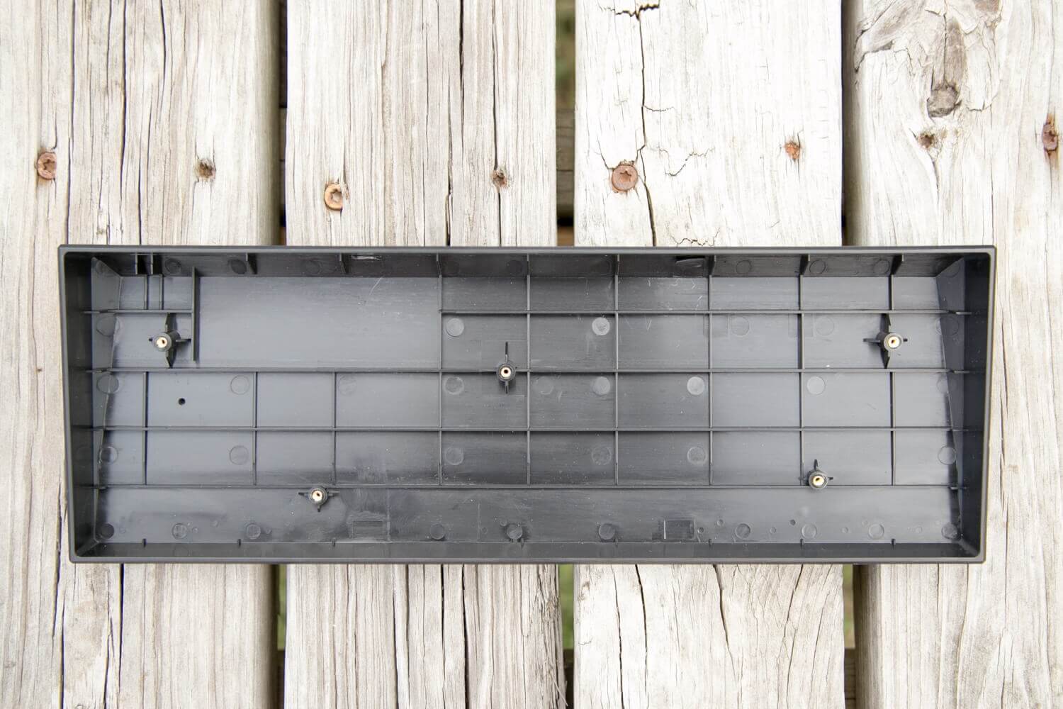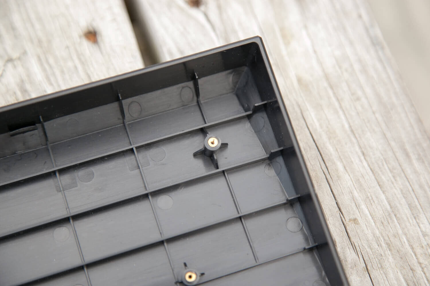 Here you can see the metal receptacle for the machine screws. There are 5 screws total, and that’s all that must be removed to separate the plate/pcb and case. Not all the keycaps must be removed to separate these items – just caps in the right places.