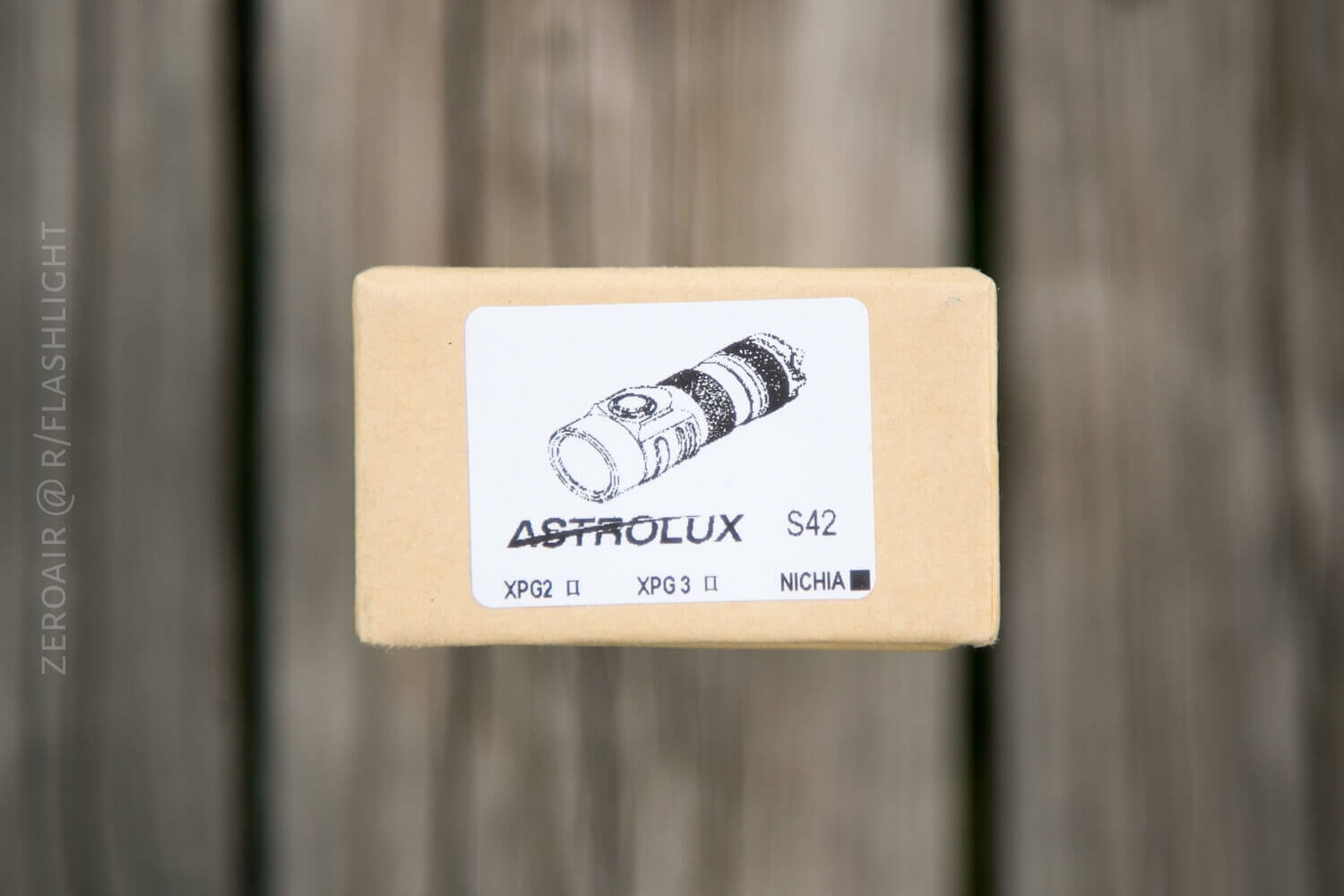The s42 arrives in a slip-fit cardboard box. It’s extra nice because the top has cutouts, so a user can grab the bottom (instead of just waiting for the halves to fall apart). There’s not much printing – just a brand name. There is a descriptive sticker, however, with the light and emitter info.