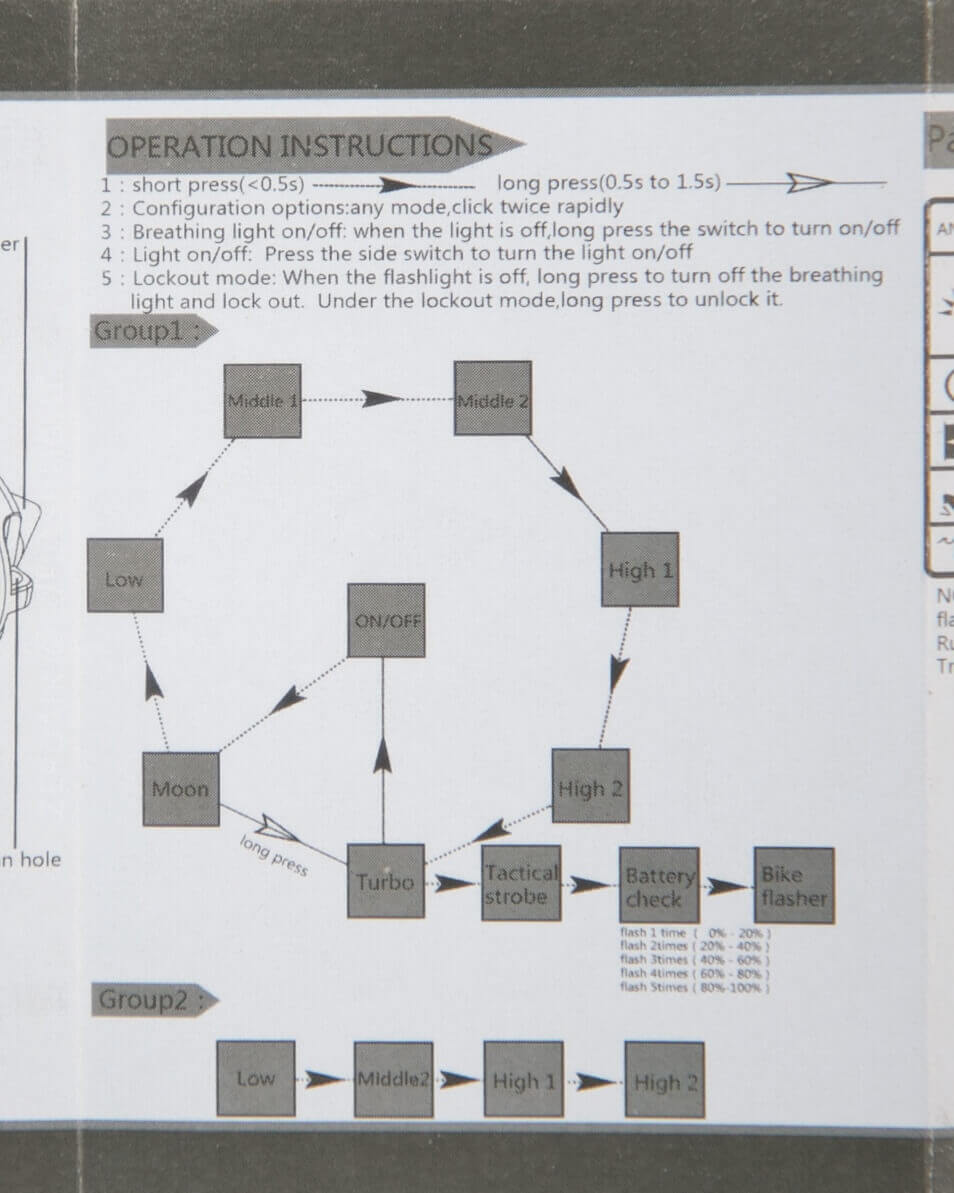 There are two mode groups available. Group 1 is the more complex, and group 2 is a simple four-mode option. There are two ways to switch modes: short-press or long-press. In either group, short-pressing the button will change modes. Long pressing will get Turbo (G1 only). While in Turbo, a short press will cycle: Tactical Strobe, Battery Check, and Bike Flash. In both groups, the modes cycle from Low to High. In my experience, one must just play finger gymnastics to get the light to turn off. Like my Facebook friend’s new relationship status: It’s Complicated.