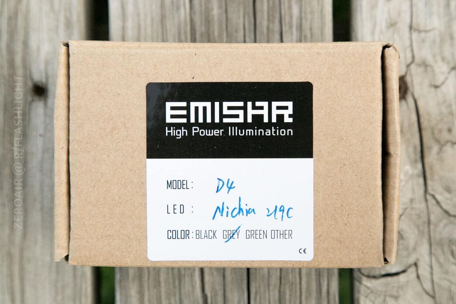 The Emisar D4 package is a simple corrugated box, with the model specifics handwritten. Even the model is not printed, because there’s another Emisar model now!! The D1, which is a thrower version of this light, sort of. The handwriting shows the emitter option, too.