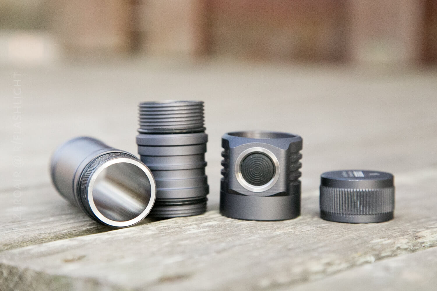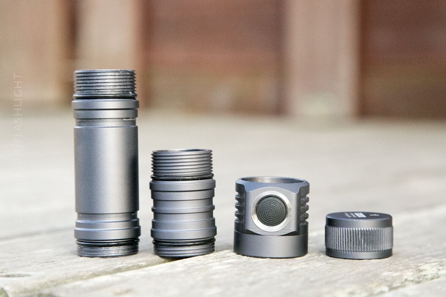 Here are the parts disassembled. I didn’t take the head apart (side switch heads like this intimidate me in that way). But be aware that removing the driver isn’t all that easy, as it’s held in place by thermal epoxy (or maybe just potted, I’m not sure.) Notice that the threads are quite beefy, and also square-cut (my favorite). They’re also anodized, which I also prefer. The cell tube is thick and not tapered. Also, note that the cell tubes are directional – the thread area is twice as long on one end as the other.