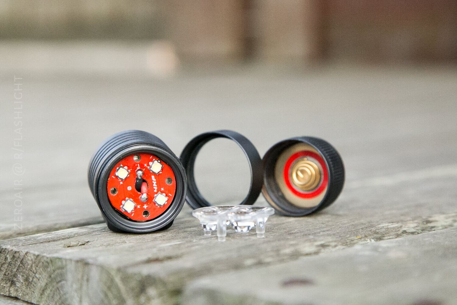 The bezel unscrews from the head easily, and the optic can be removed too. The feet of the optic rest in holes on the MCPCB, as seen in the last photo of this group.