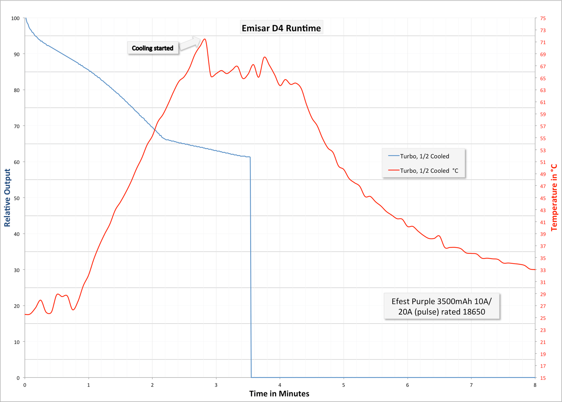 Even just using one high-drain cell (and boy, does this light like high-drain cells), you can still break things. Below is the only runtime test I did with this light, in part because the D4 killed the cell I was using, and Efest Purple 3500mAh “10A continuous/20A pulse” button top cell. This was the highest-drain cell I could find in my house.