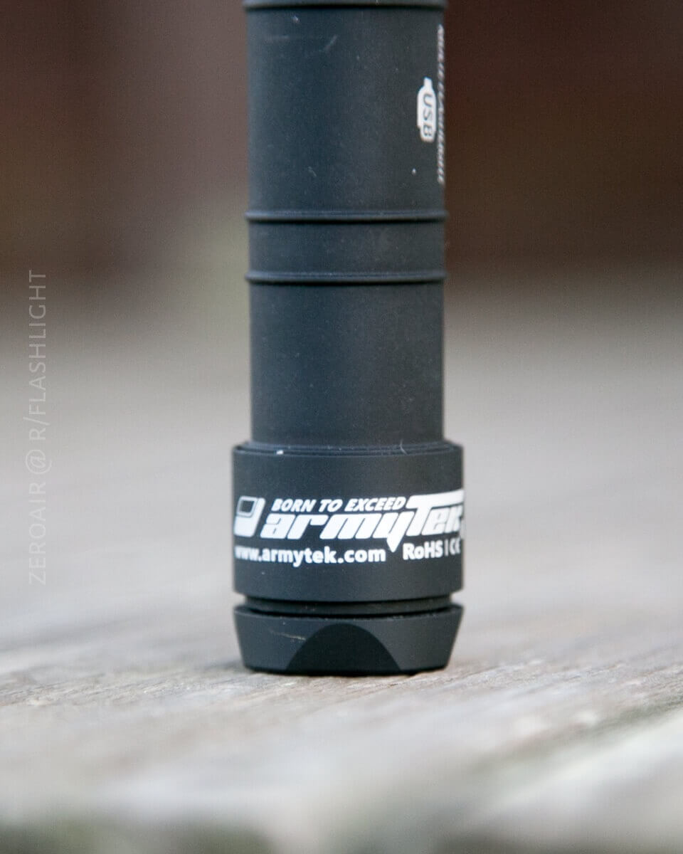 And of course, the body of this Armytek is highly branded. The head gets branded with the light specifics, and the tailcap gets branded with the brand specifics. The body of the light has the model name and info.