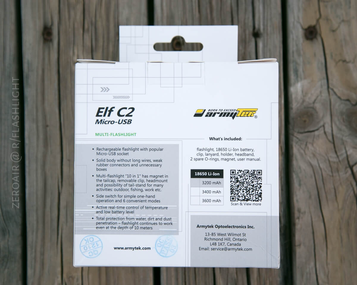 The package of the Elf C2 is a display-ready hanging package, with a window that shows off the light. The box, like the light, is highly printed with specs and whatnot. The light and goodies rest in a plastic tray.