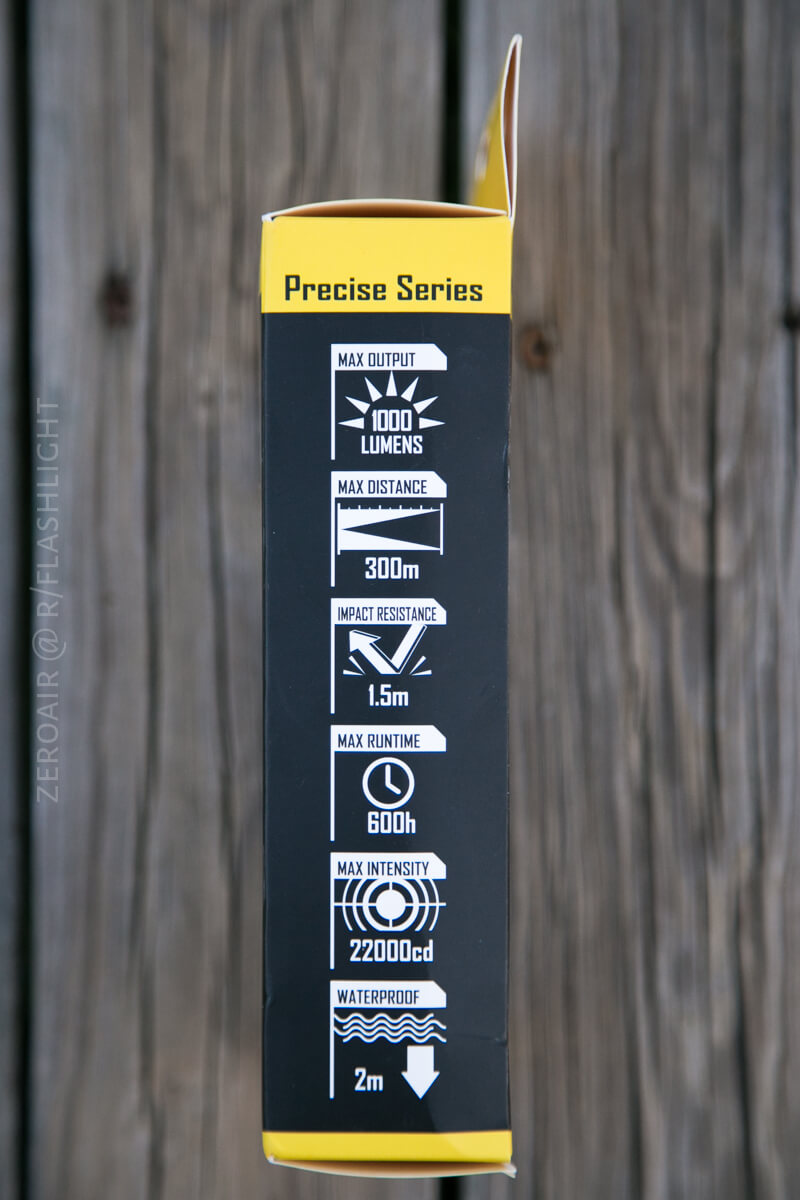 The package is typical Nitecore – black and orange cardboard, and highly printed. The box really does a good job of describing the light, in fact (down to the fact that it accepts only button top cells!)