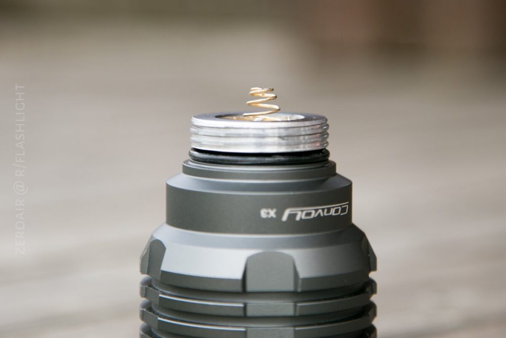 Here’s the spring on the head. The driver is held in place by a screwed-down retaining ring. The tailcap has a nice firm spring as well.