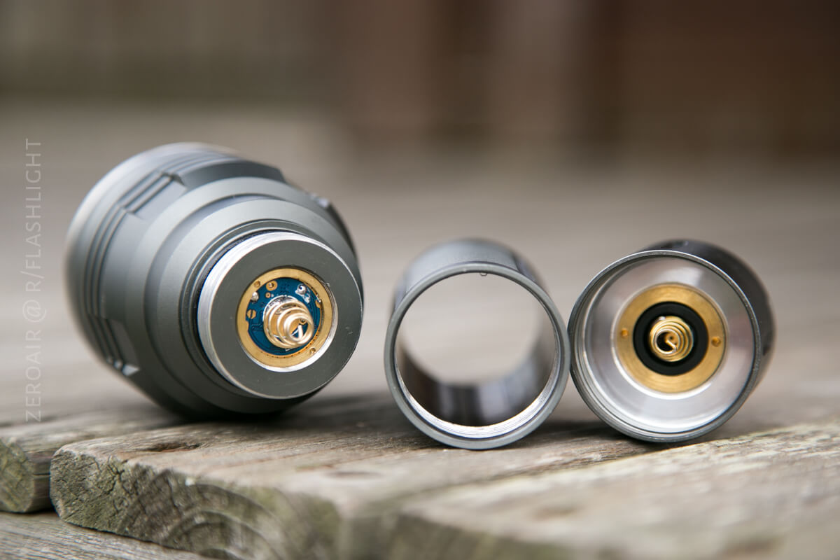 There are two loose o-rings included, and they must be used as follows: With the AAx3 option, the o-rings rest on (not around) the top and bottom of the adapter. With the 26650 option, the o-rings go around the body of the cell to prevent rattle. The o-rings aren’t used with the 18650 adapter (but that’s where I store them since that’s the setup I use most often).