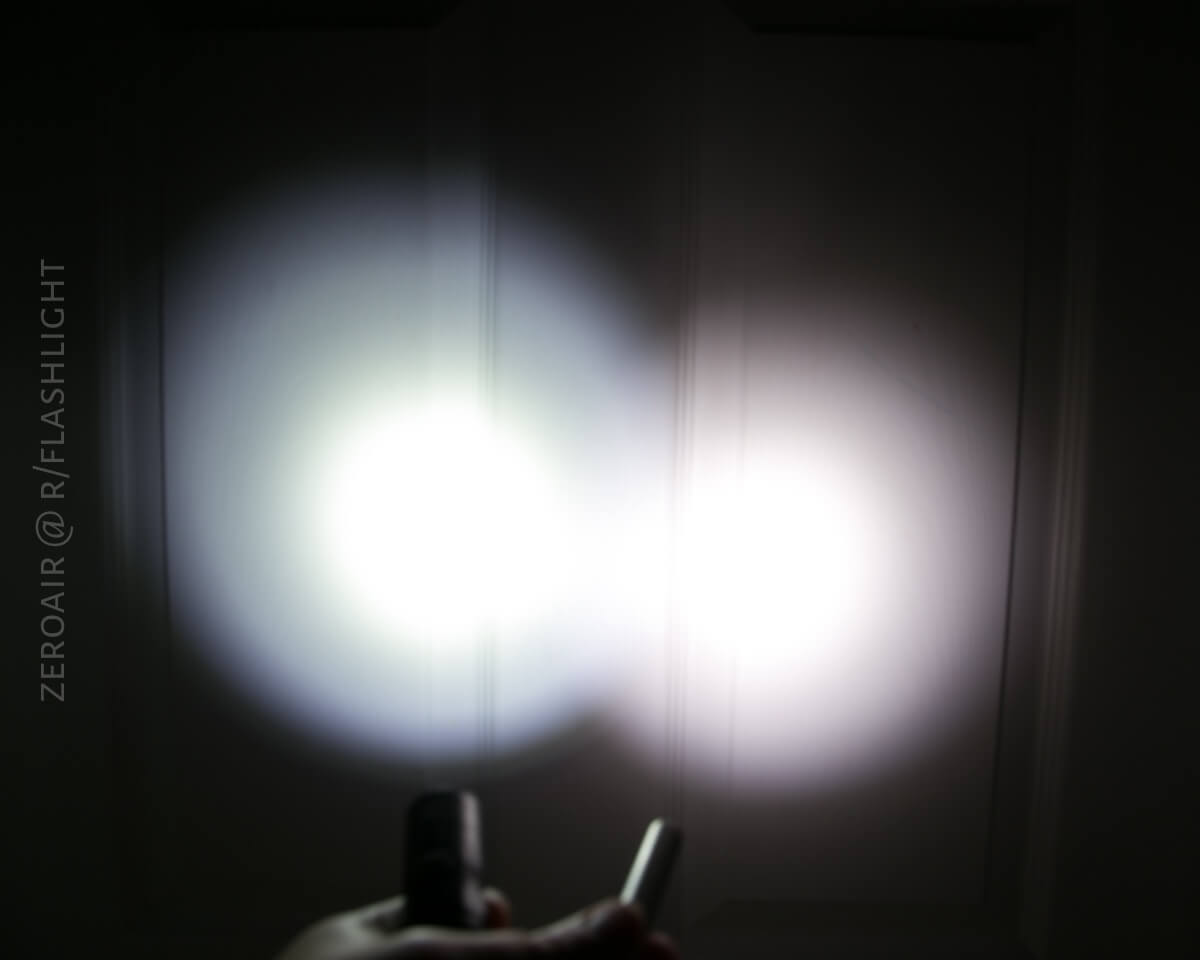 The performance with 2-up 18350’s seems to actually be a little worse than with an 18650. I can’t explain that, but I will say the voltage indicator read “4.2V” – maybe 2×18350 confuses the light (overvoltage), and it’s really better (if you’re going to use 2x cells), to use RCR123’s like the manual states. I don’t have two of those to test with, unfortunately.